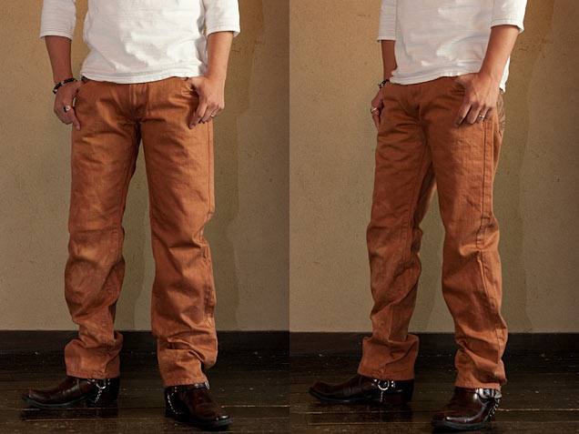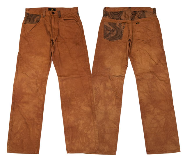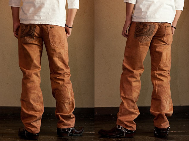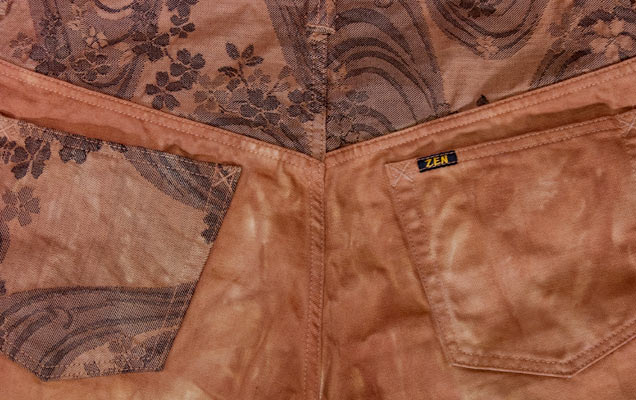 柿渋色に染め上げられたジーンズです。腰とバックポケット部分の流水櫻文様のジャガード生地がさりげなく目立ち、落ち着いた着こなしが楽しめるカラーとなっております。