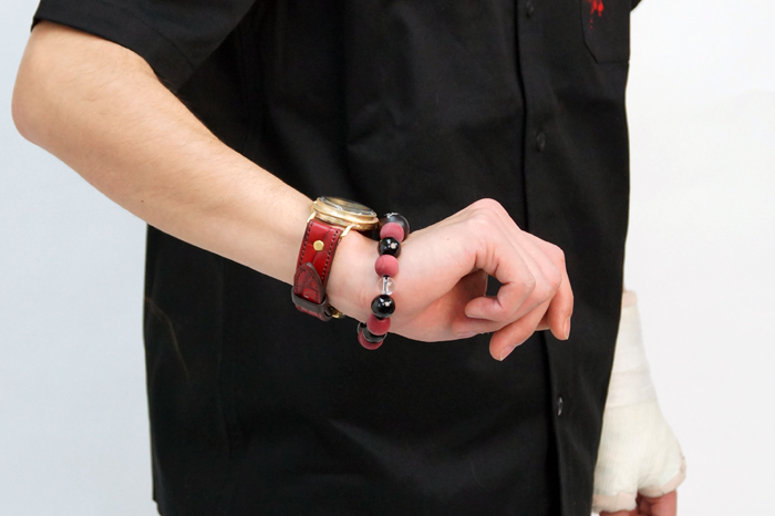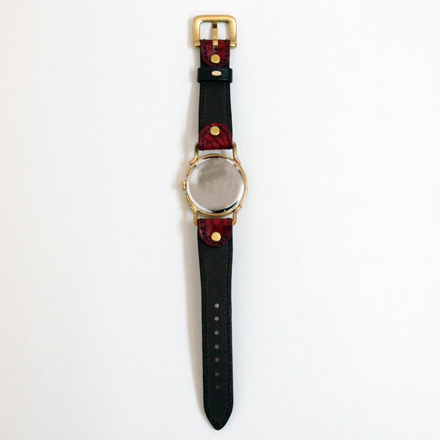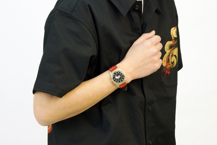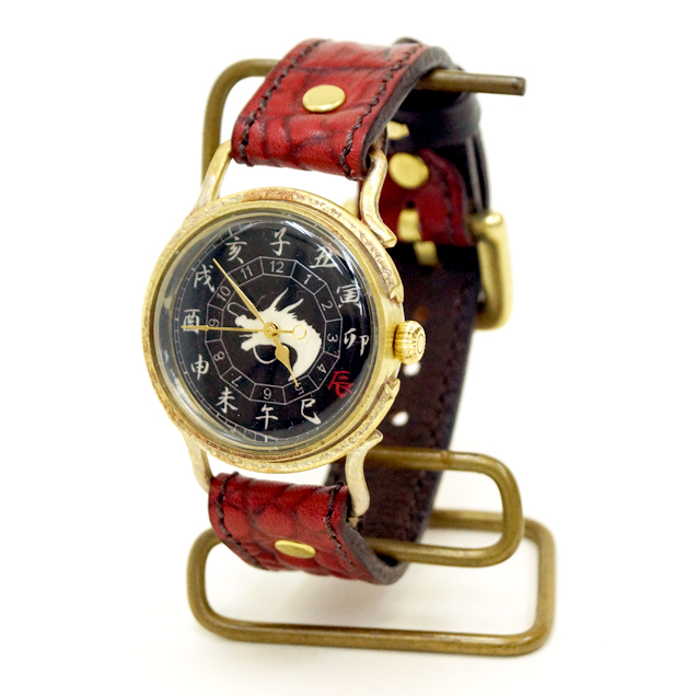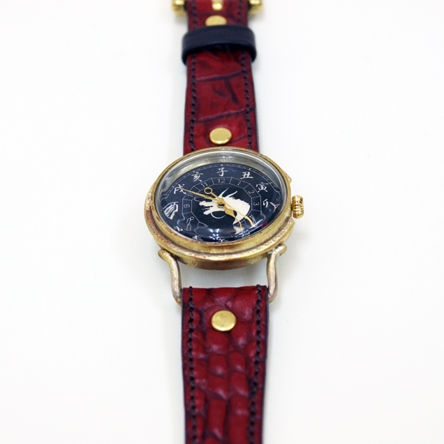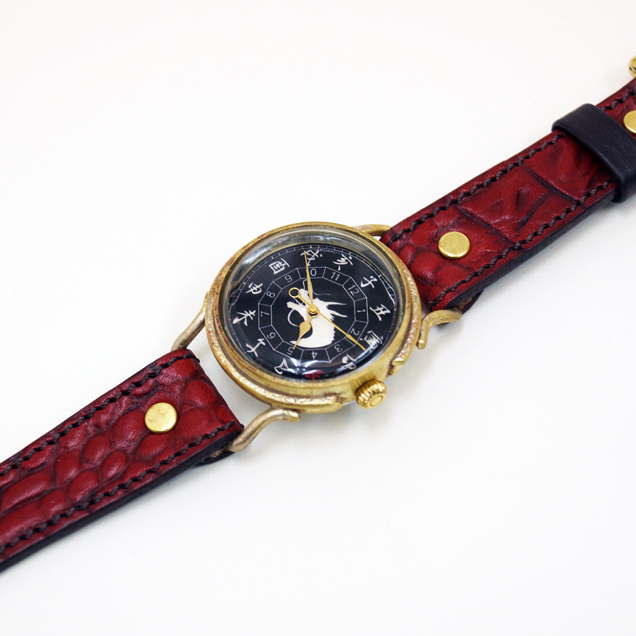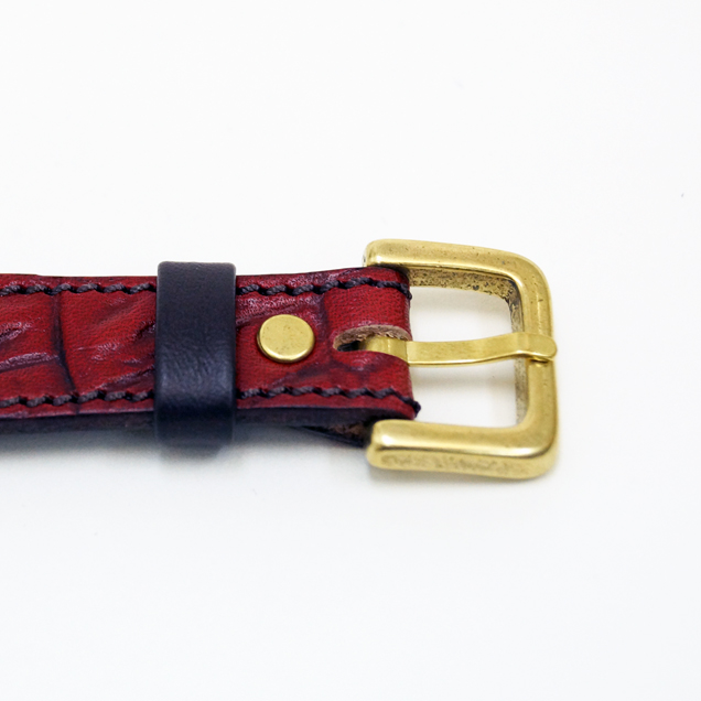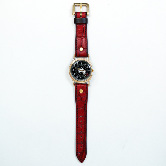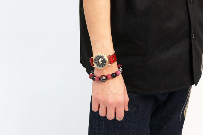 クロコの型押しをした牛革を落ち着いた色の紅で手染めしています。時計ケースの下に革をひいた存在感のある真紅大人気ですので下記のバナーから一度ご覧下さい。まら今春リリースされた赤龍のTシャツやジーンズなどの洋服や財布や念珠シリーズの雑貨と一緒にお楽しみ下さい