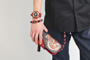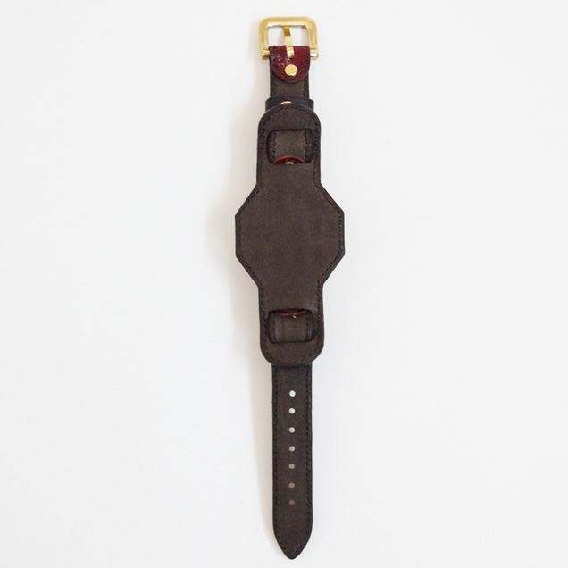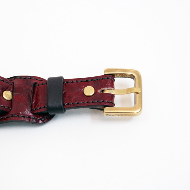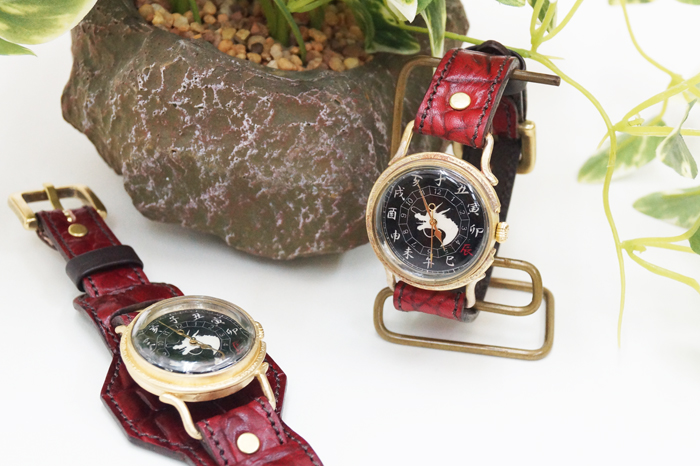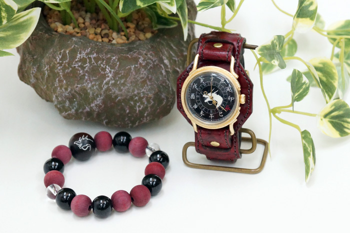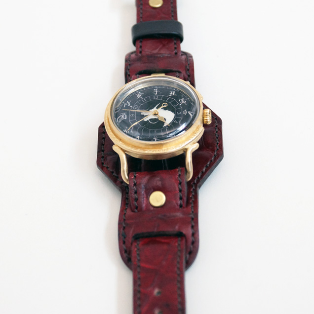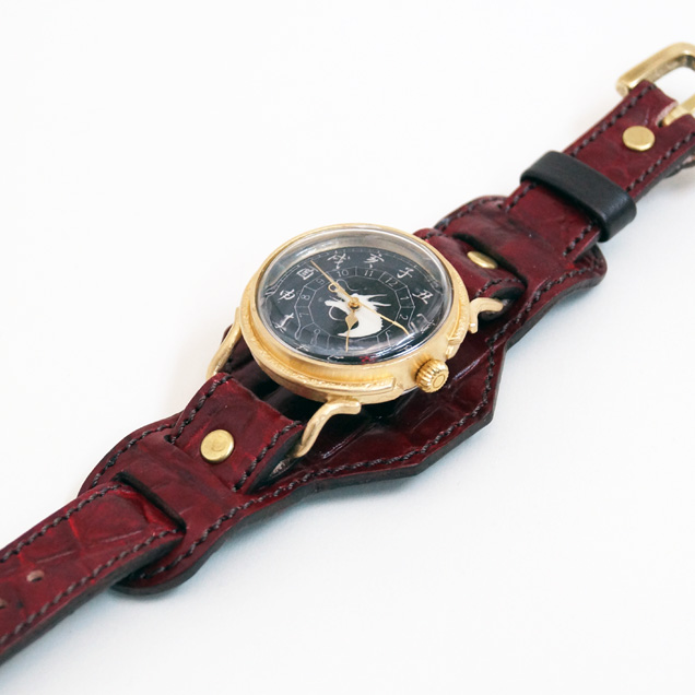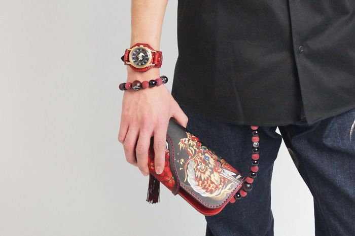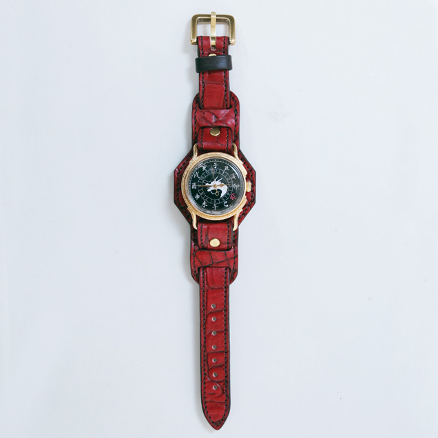 クロコの型押しをした牛革を落ち着いた色の紅で手染めしています。金メッキを施した時計ケースの下に革をひき存在感のある時計となっております。アクセサリーとしても活用できそうですね。今春リリースされた赤龍のTシャツやジーンズなどの洋服や財布や念珠シリーズの雑貨など他の赤龍シリーズと一緒にお楽しみ下さい