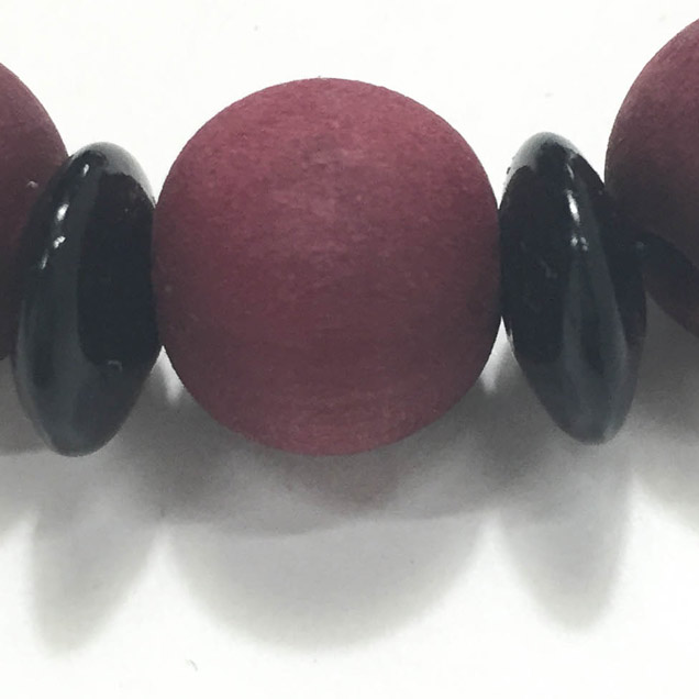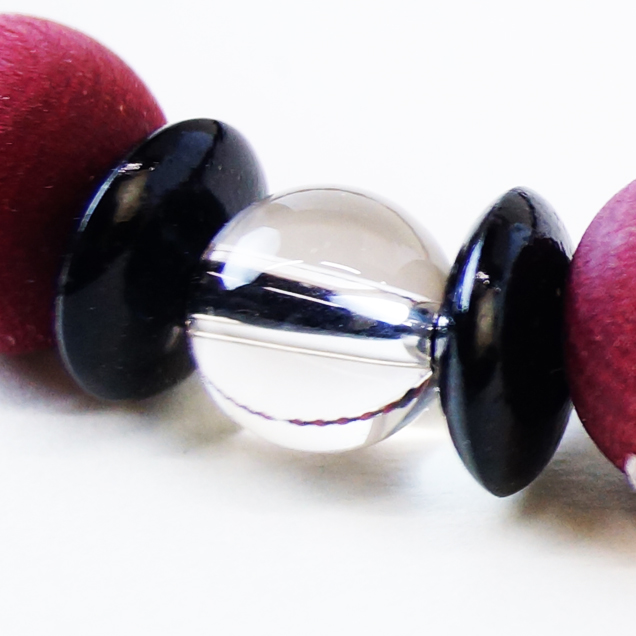 木念珠の四神シリーズ第2段【朱雀】の腕輪です。渋めの赤に染められた木の珠を黒檀のそろばん珠で挟みました。