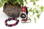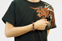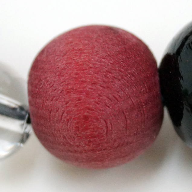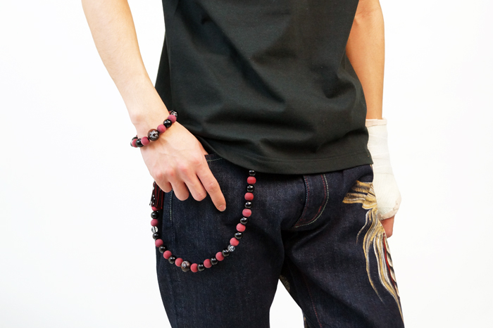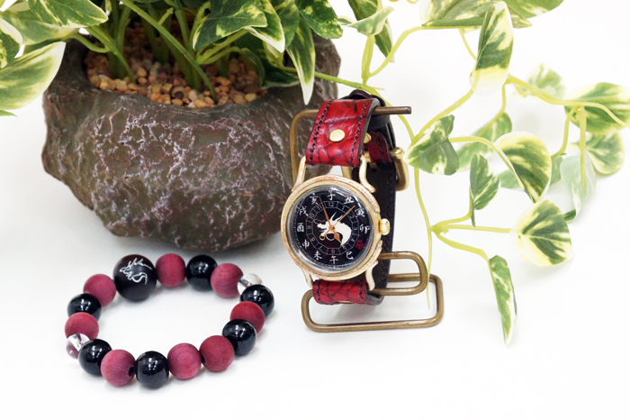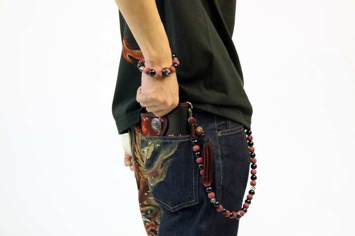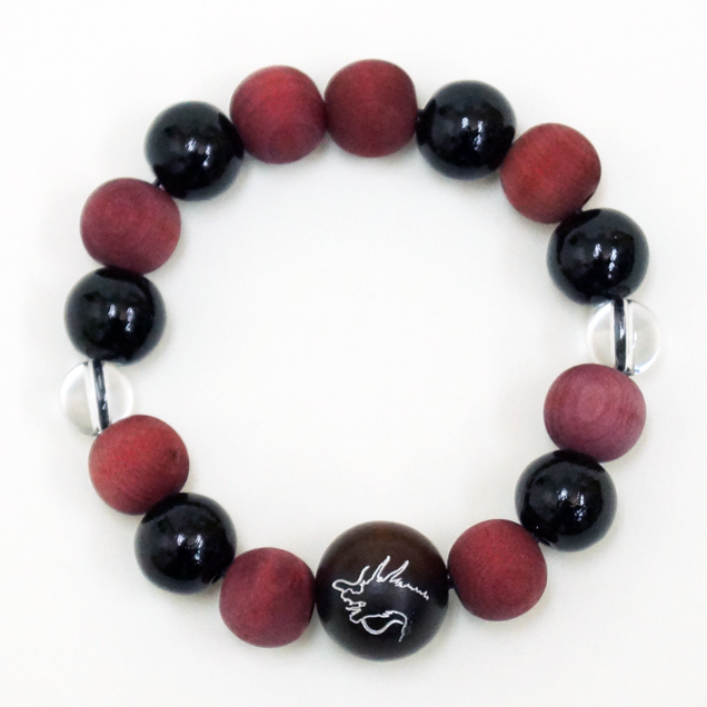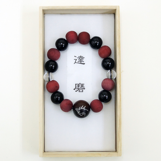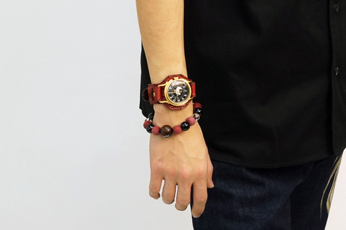 赤龍の腕輪念珠は赤く染めた木珠と艶のある黒檀を交互に配置しミカン珠より少しハードな印象に仕上がっています。赤と黒という配色が和柄好きの心をくすぐります。同時にリリースされた赤龍の手創り時計と良く合いますよ。時計に限らず他の雑貨や洋服も是非一緒にお楽しみ下さい