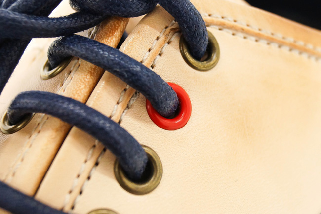 アイレット(ハトメ)を1つだけ赤にしてアクセントをつけています。