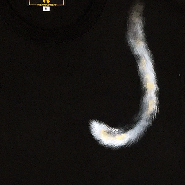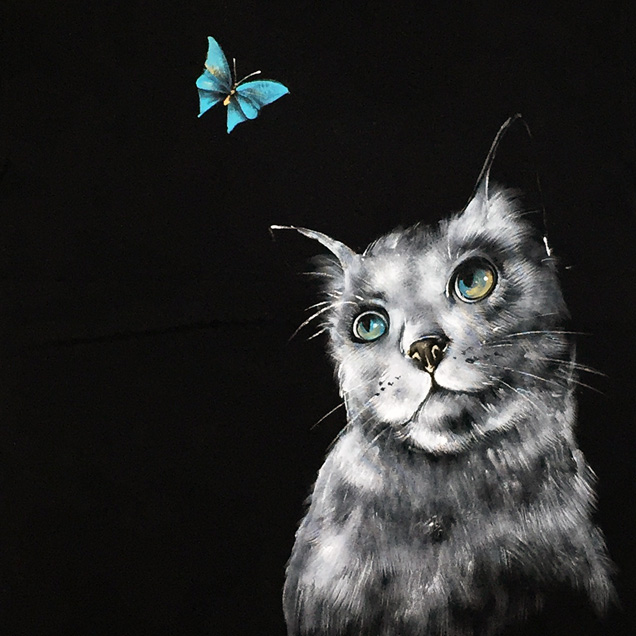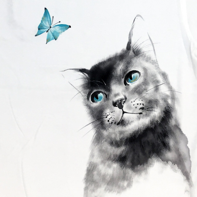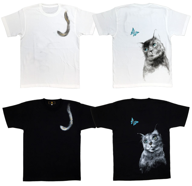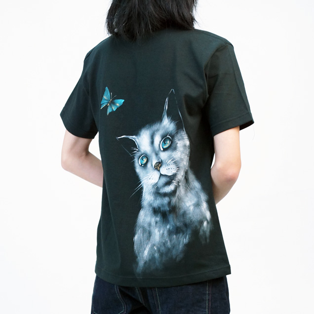 これまで禅ではなかった雰囲気の手描きTシャツ " 猫と蝶々" 。エメラルドブルーの蝶々を見上げる猫の目も綺麗なエメラルドブルーに映っています。Tシャツに絵を描くというより絵をTシャツにしたという表現の方は正しいのかもしれません。幻想的な絵柄が印象的なTシャツをお楽しみ下さい。【素材】綿100%