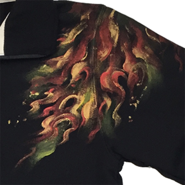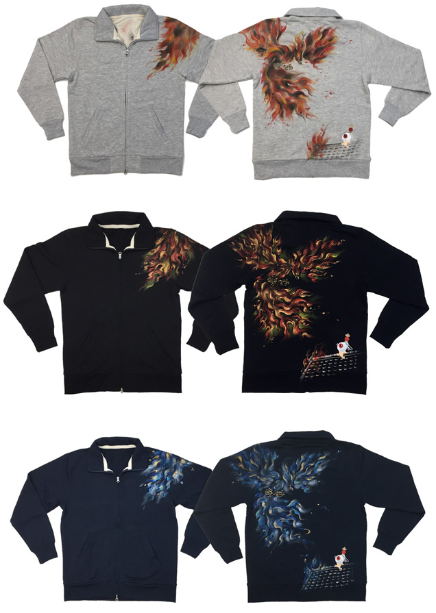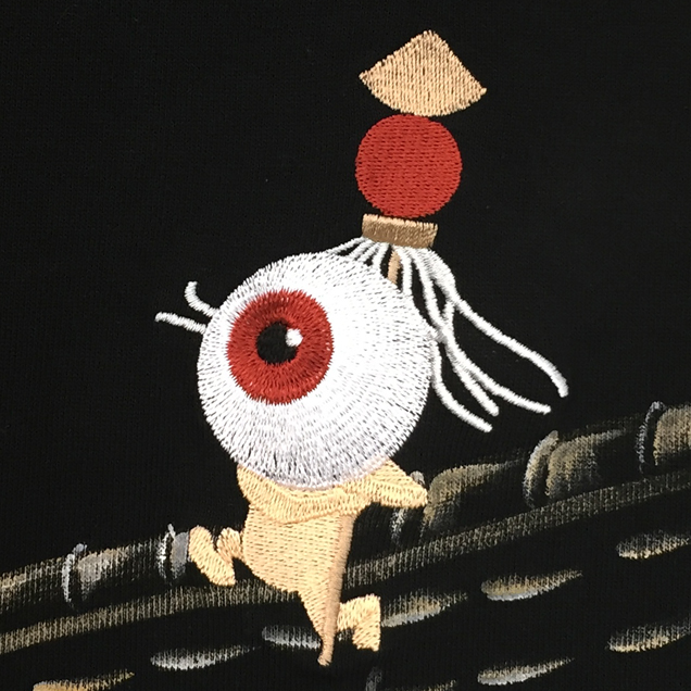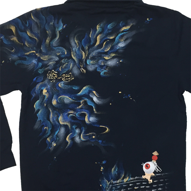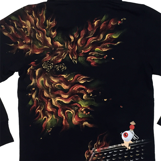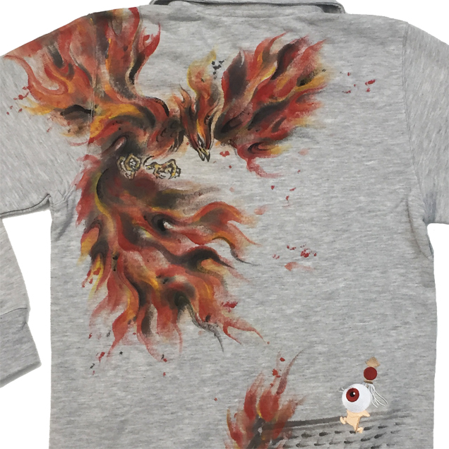 2017年秋の目玉親父アイテムは火鳥がもたらす火事現場で勇敢に炎と向き合う目玉親父のジップジャケット。軽く羽折れるライトアウターとして重宝するアイテムです。目玉親父シリーズでは初アイテムというのもポイントです。限定カラーの紺色Tシャツは火鳥が青に燃えているのが印象的。同時にリリースされる定番アイテムの火消し親父ロンTも必見の価値有です。紺色は88枚限定