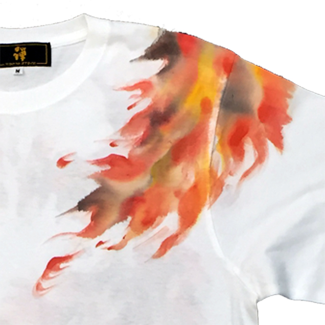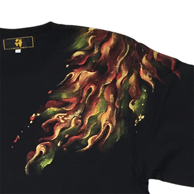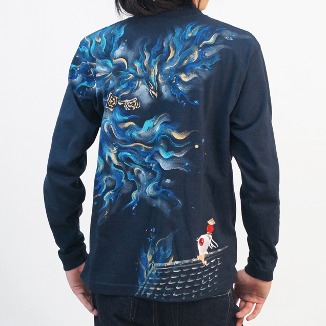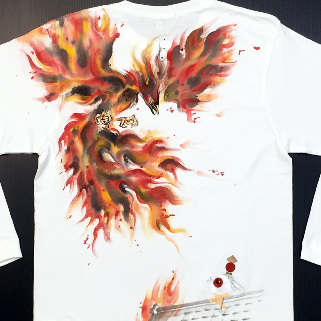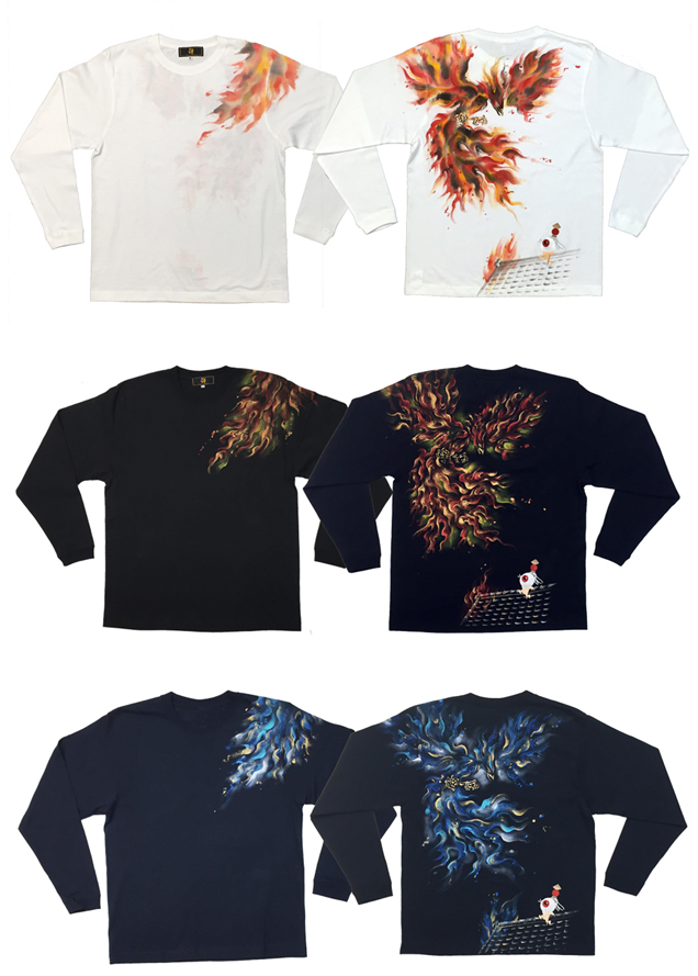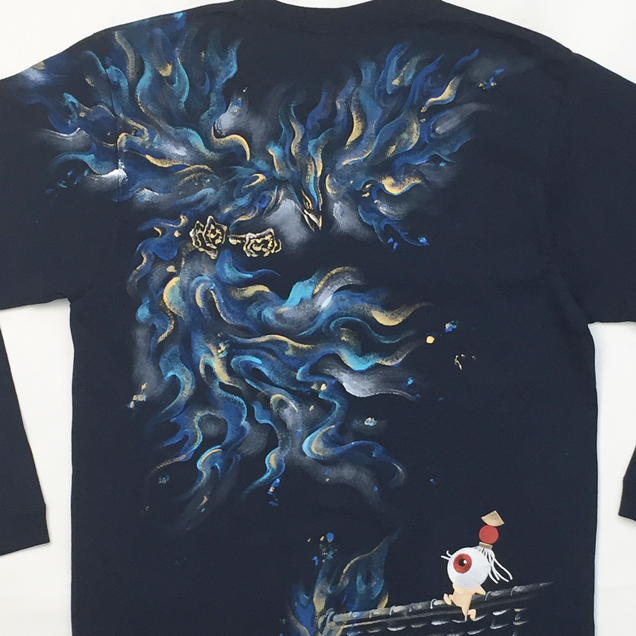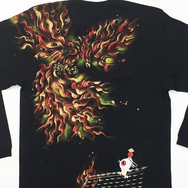 2017年秋の目玉親父Tシャツは火鳥がもたらす火事現場で勇敢に炎と向き合う目玉親父のロンT。限定カラーの紺色Tシャツは火鳥が青に燃えているのが印象的。同時にリリースされる火消し親父のジップジャケットもライトアウターとして必見の価値有です。紺色は88枚限定