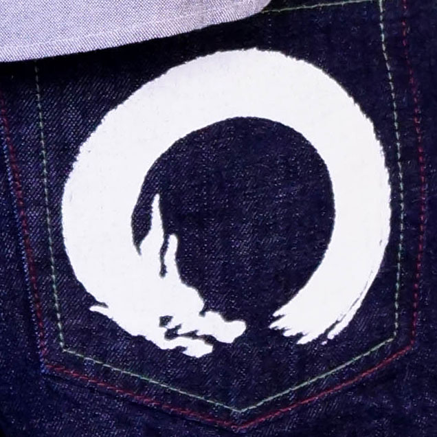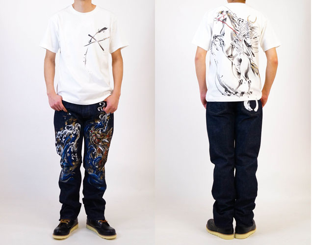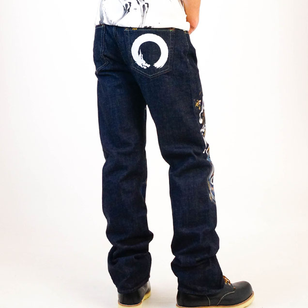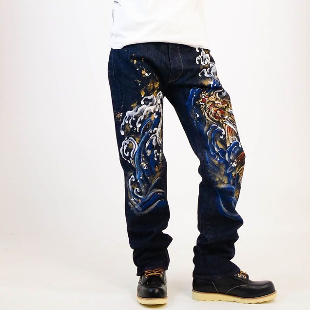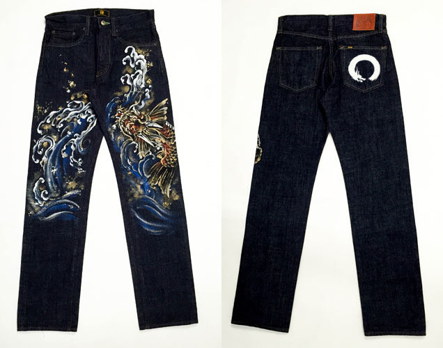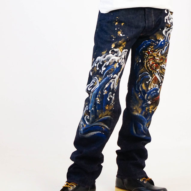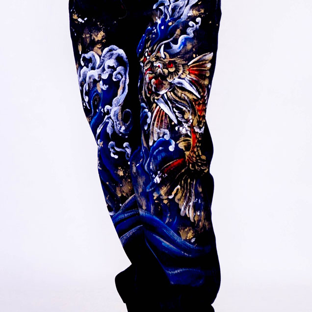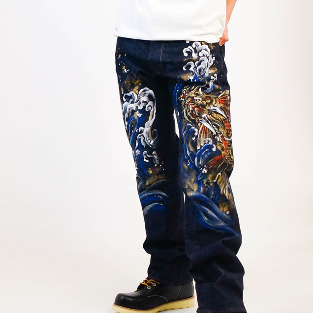 立身出世、つまり成功を意味する登龍門の手描きジーンズです。