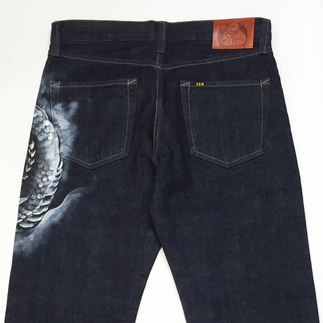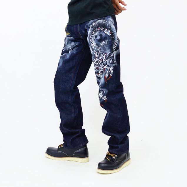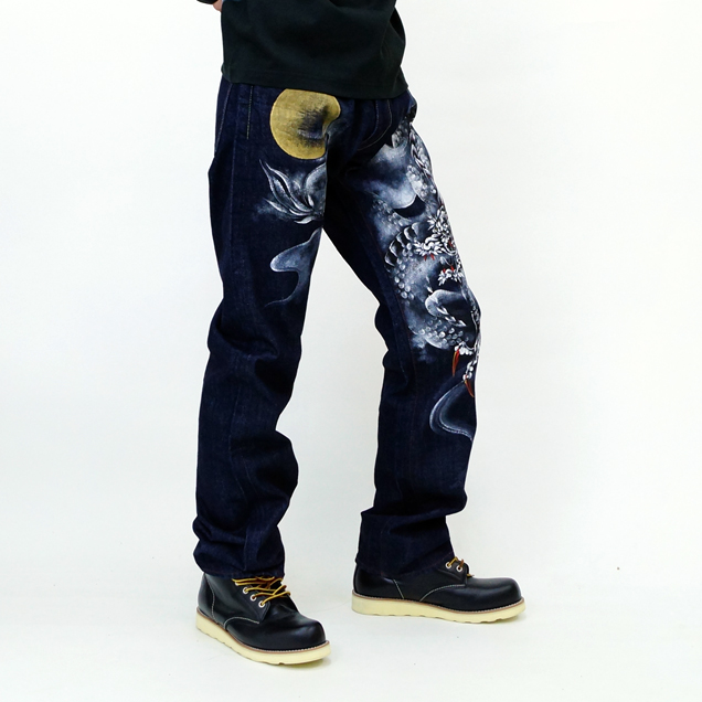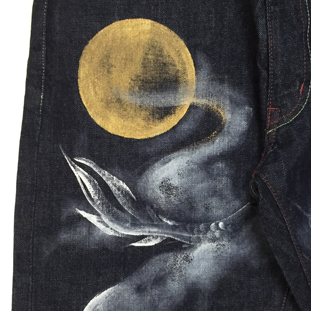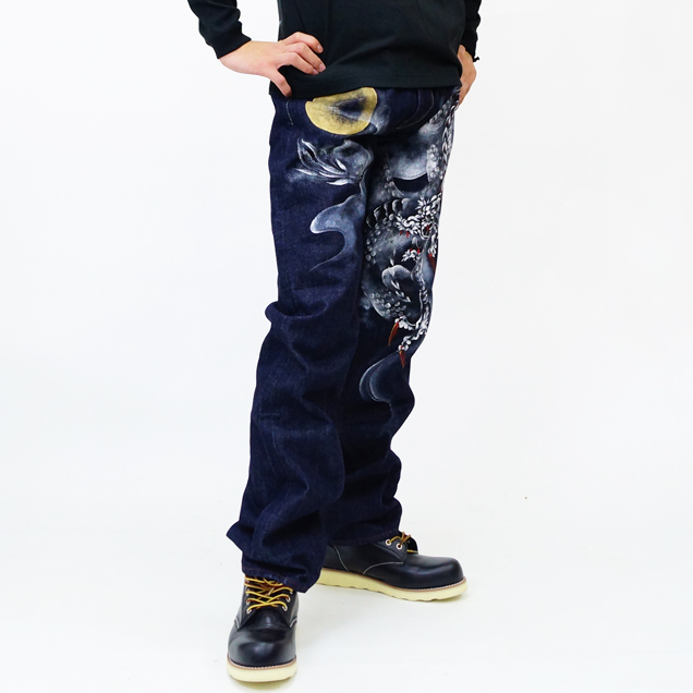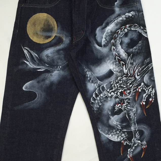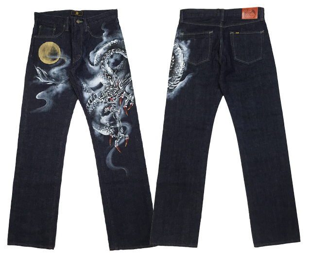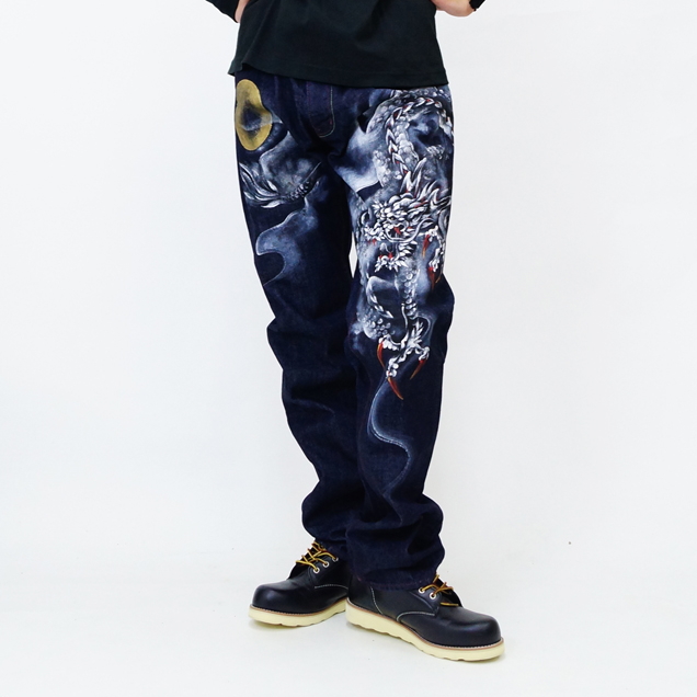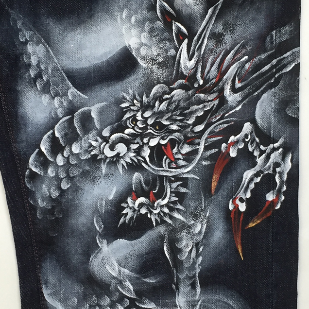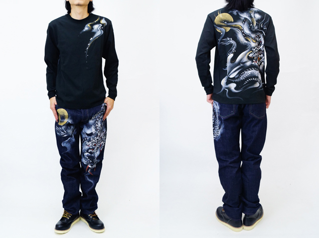 赤い牙と爪、黒い瞳、死神をイメージし独特の世界感を放つ龍柄に仕上がりました月夜に舞い、死を誘うかのような幻想的な雰囲気はこれまでの龍のTシャツやジー