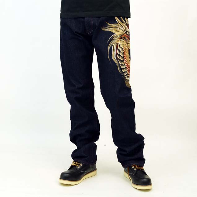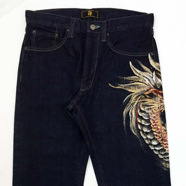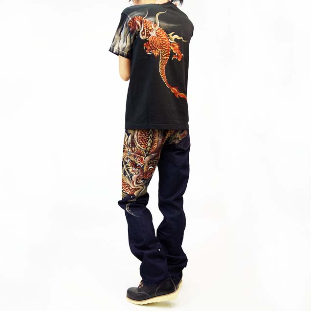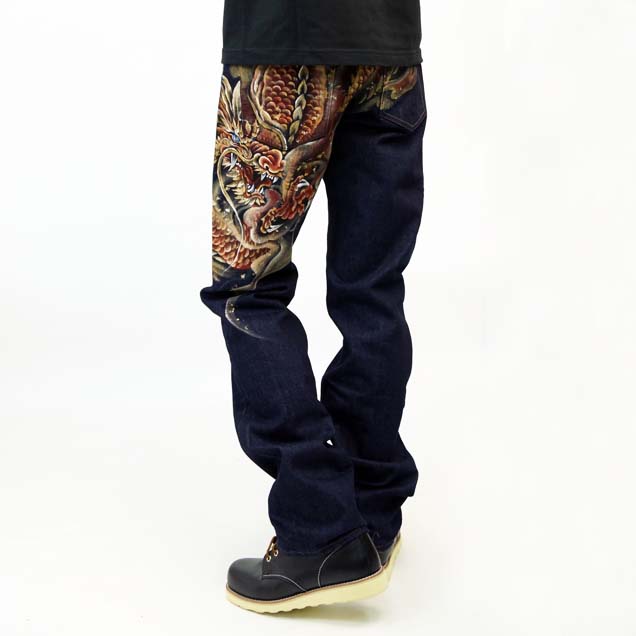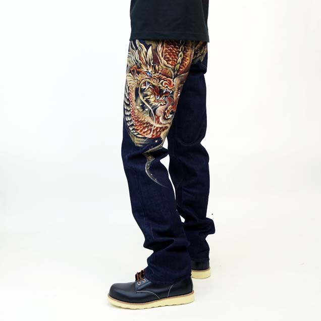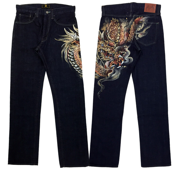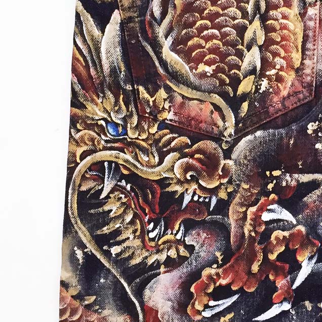 これまで無かった配色で龍を描きました。構図もバックに絵柄の中心をおいた目新しいジーンズに仕上がっています。絵柄としては定番の龍やでも色や配置を変える事で新鮮な印象を与えてくれます。Tシャツやワークシャツや雑貨と一緒にお楽しみ下さい素材】綿100%