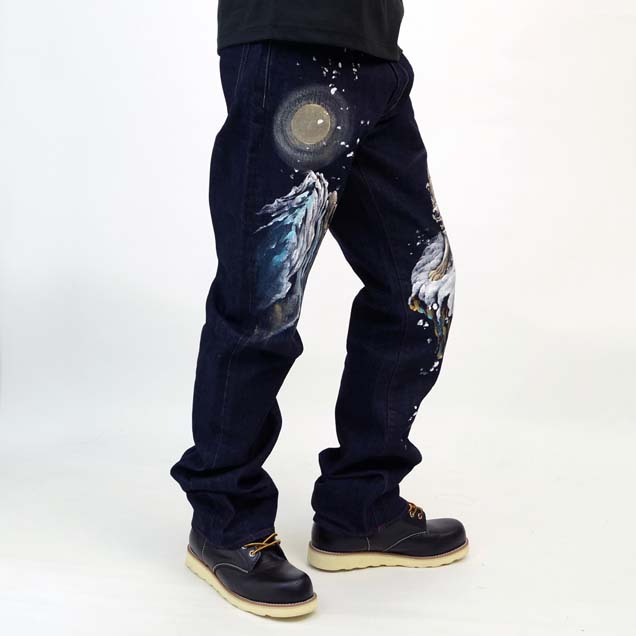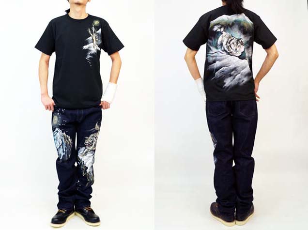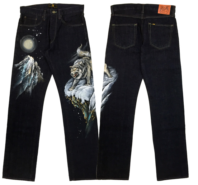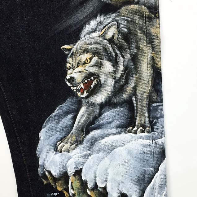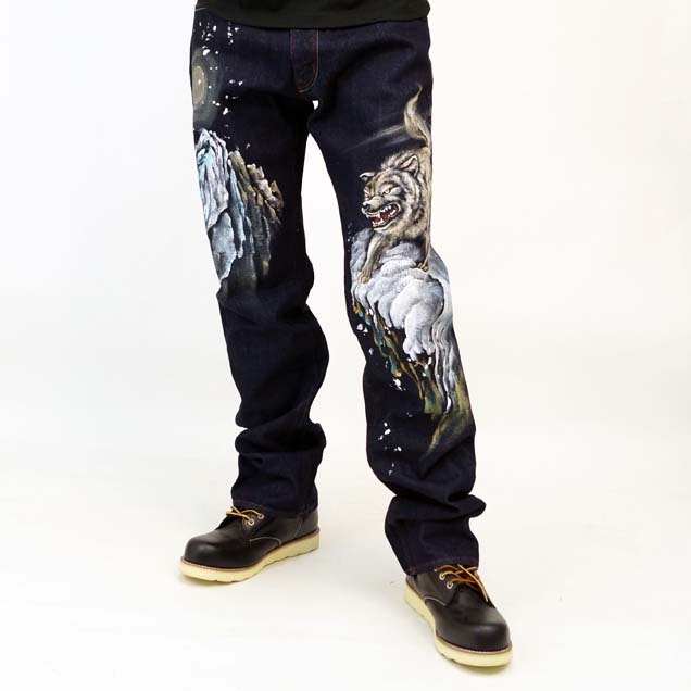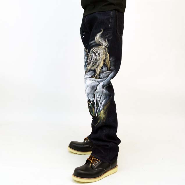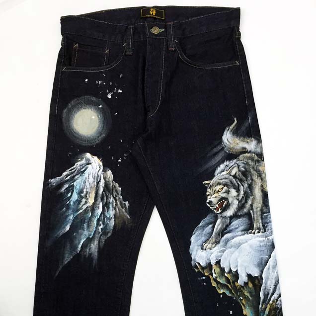 人気絵柄の"狼"の新柄が登場。今回は相手を威嚇するように牙をむく狼が印象的。以前リリースされた狼柄ジーンズの銀狼とは一味違う強くて迫力のある狼柄ジーンズです。一緒にリリースされるTシャツと一緒にお楽しみ下さいサイズ