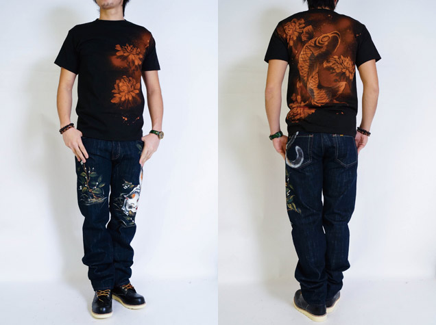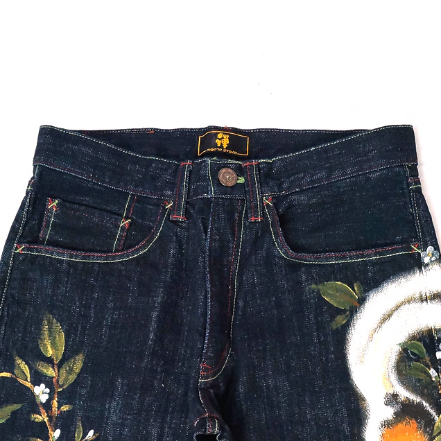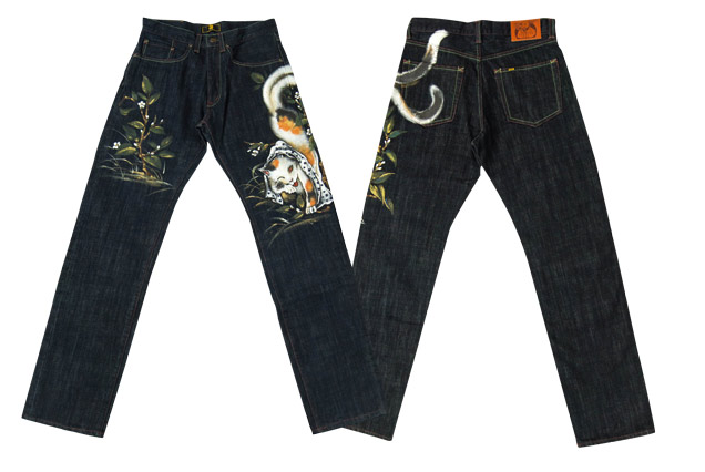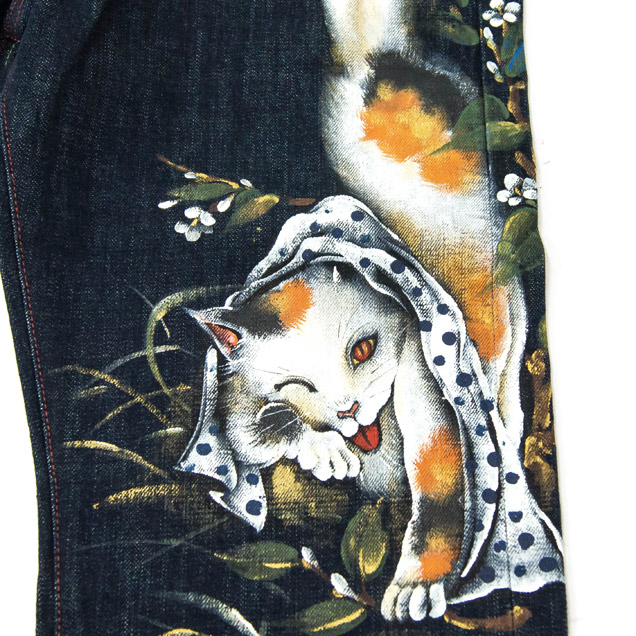好評の長袖Tシャツ「猫又」のジーンズ化希望の声を受けて実現したアイテム。二股に分かれ大きくうねる尾や鋭く光る赤目など、可愛らしさの中に