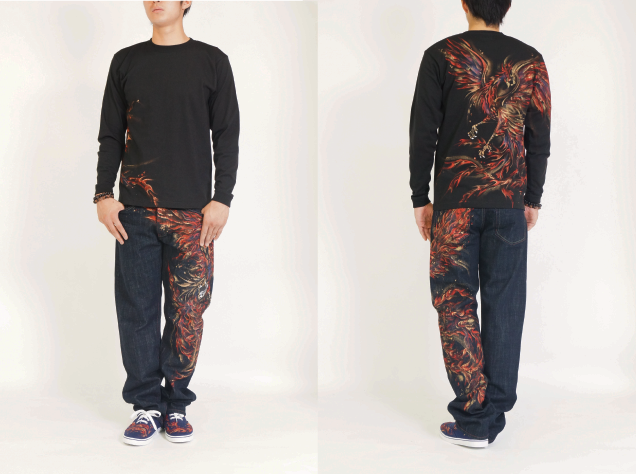 舞い踊るような朱雀がジーンズを赤く染めます。赤と金を基調とした色使いに差し色の青を入れることで幻想的な雰囲気を演出した。