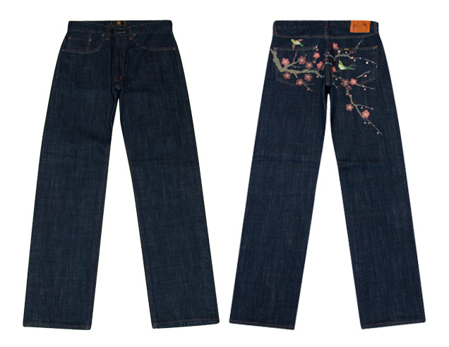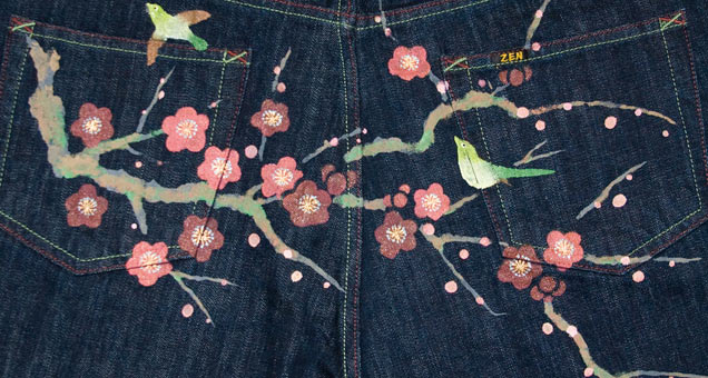 色鮮やかな梅に、若草色の綺麗な鶯がとまっている様です。梅と鶯は春の訪れを感じさせる日本ならではの情緒溢れる絵柄。華やかな色使いなので男女関係なく履いていただけるジーンズとなっております。デニムの名産、岡山は倉敷市児島で制作したオリジナルジーンズに、京都の着物友禅絵師が一本づつ柄を手で描いた作品です。