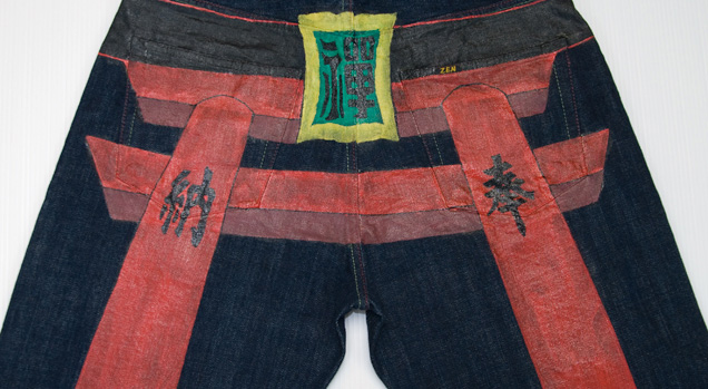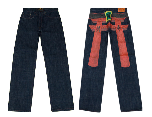 前代未聞の鳥居をモチーフにしたジーンズの完成です。ヒップ部分から両足にかけて伸びる鳥居がインパクト抜群!正しい使用方法は、なるべく人の前を歩く事、拝まれます!!!