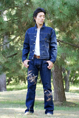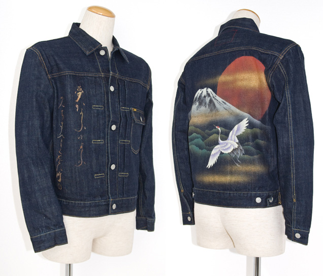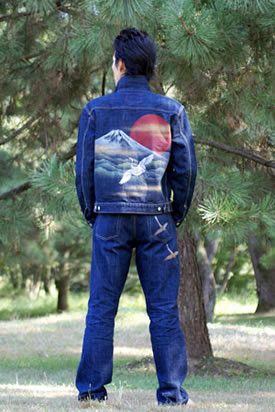 デニムの名産、岡山県倉敷市の児島で製作したデニムジャケットは、セカンドタイプの胸ポケット、背面タックを無くした禅オリジナルとなっており、 そこに、京都のきもの友禅絵師が一本ずつ柄を手で描いた作品です。手描きの為、筆の強弱で一点ずつの 商品のタッチが微妙に変わり世の中に全く同じものは存在しません。