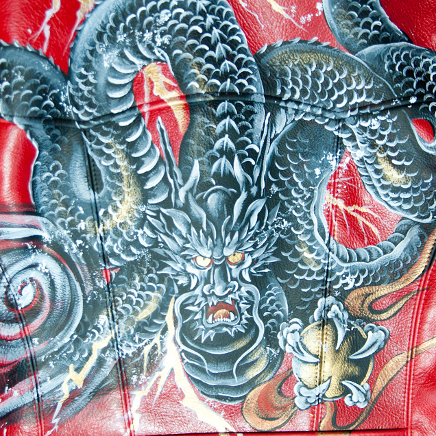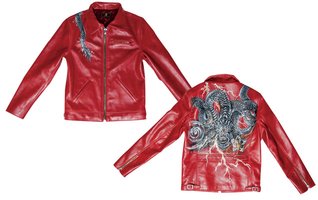 毎年恒例の手描きレザージャケット、今回は辰年にちなみ龍の図柄を採用。背中一面に稲妻と共に描かれた龍は迫力満点!