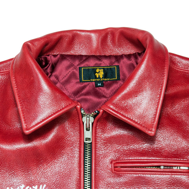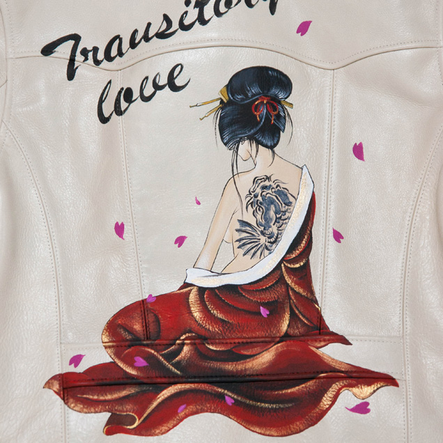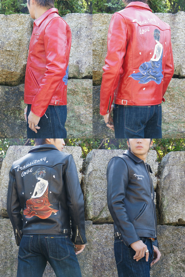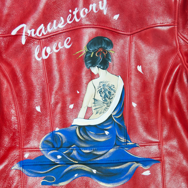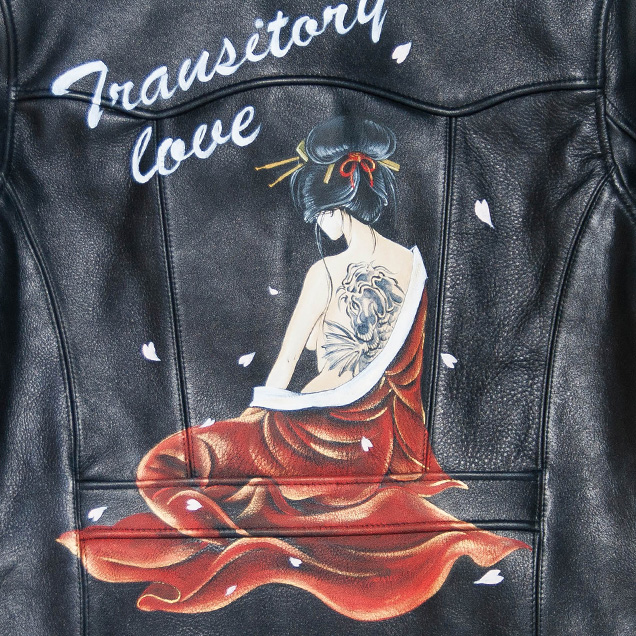 鯉の刺青を背負った京女がレザージャケットの背面に手描きされています。