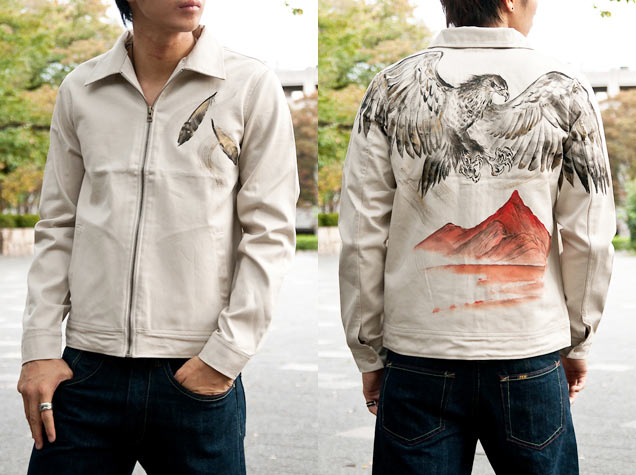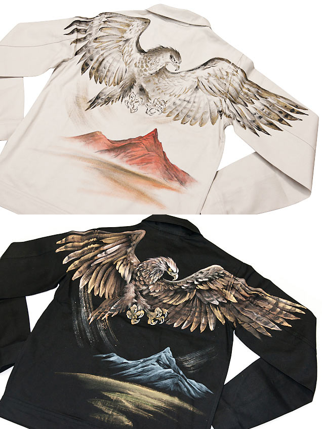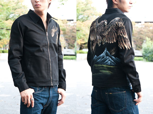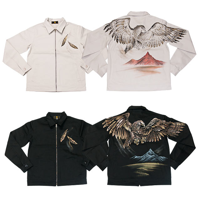力強い大鷲をワークジャケットに。鷲は風格から鳥の王者とされ、人々の信仰の対象にもなっております。肩口から出でる大鷲はまさに必見!袖にまで伸びた羽、鋭い眼光、獲物を狙う爪など、大鷲の力強さをこれでもかというほどに表現した1枚です。ボディーは綿100%のツイル生地を使用したワークジャケット。かっちりとしたタイプのジャケットですので、どんなボトムとも相性抜群!さらりと羽織るだけでキマる、無骨なワークジャケットは一枚持っていて損は無し。