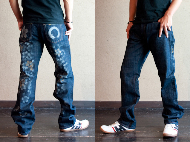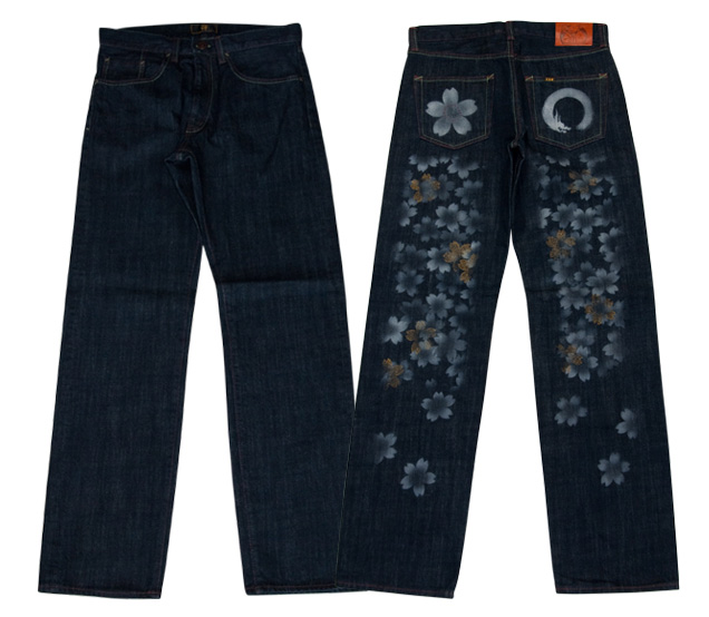 伝統工芸士である前澤氏による、ジーンズを型絵染めした商品、初のリリースです。前はシンプルに、後ろは大胆にぼかし櫻をちりばめた豪華なジーンズとなっております。幾重にも重なった櫻が幻想的です。ボディーとなるジーンズは、デニムの名産、岡山倉敷市児島で制作したオリジナルジーンズに、京都の職人が一本づつ柄を手で描いた作品です。手描きの為、筆の強弱で一点ずつの商品のタッチが微妙に変わり、世の中に全く同じ物は存在しません。