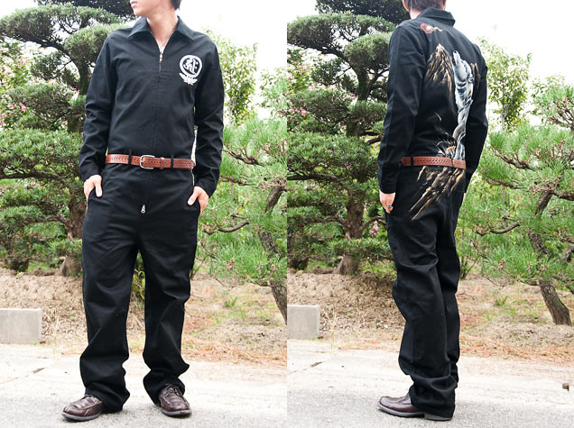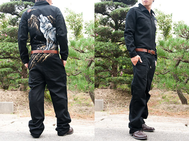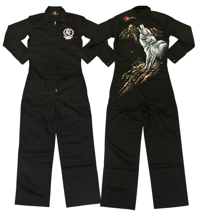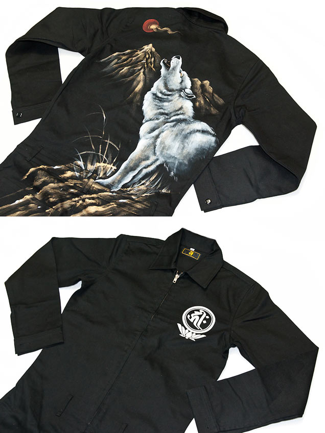 月夜に岩山から遠吠えをする銀狼を手描きしました。和柄のモチーフとしてはありそうでなかった狼柄が新鮮なつなぎです。肉食で獰猛な性質の狼を背中に背負う事で強い気持ちになれそうな銀狼のつなぎは、大胆な和柄が好きな方におすすめします。