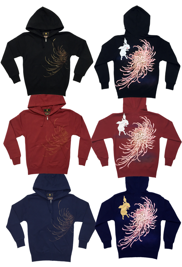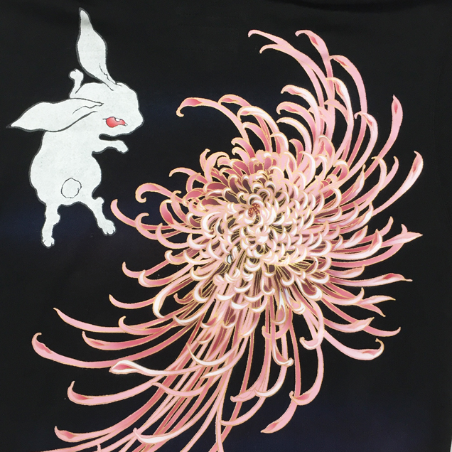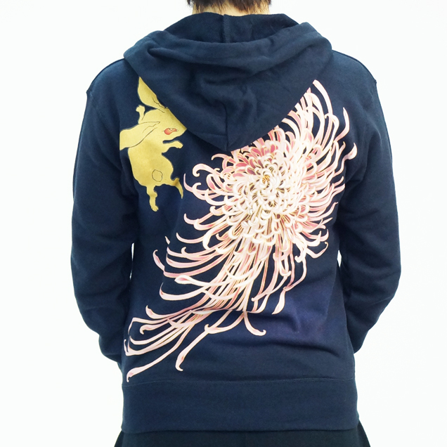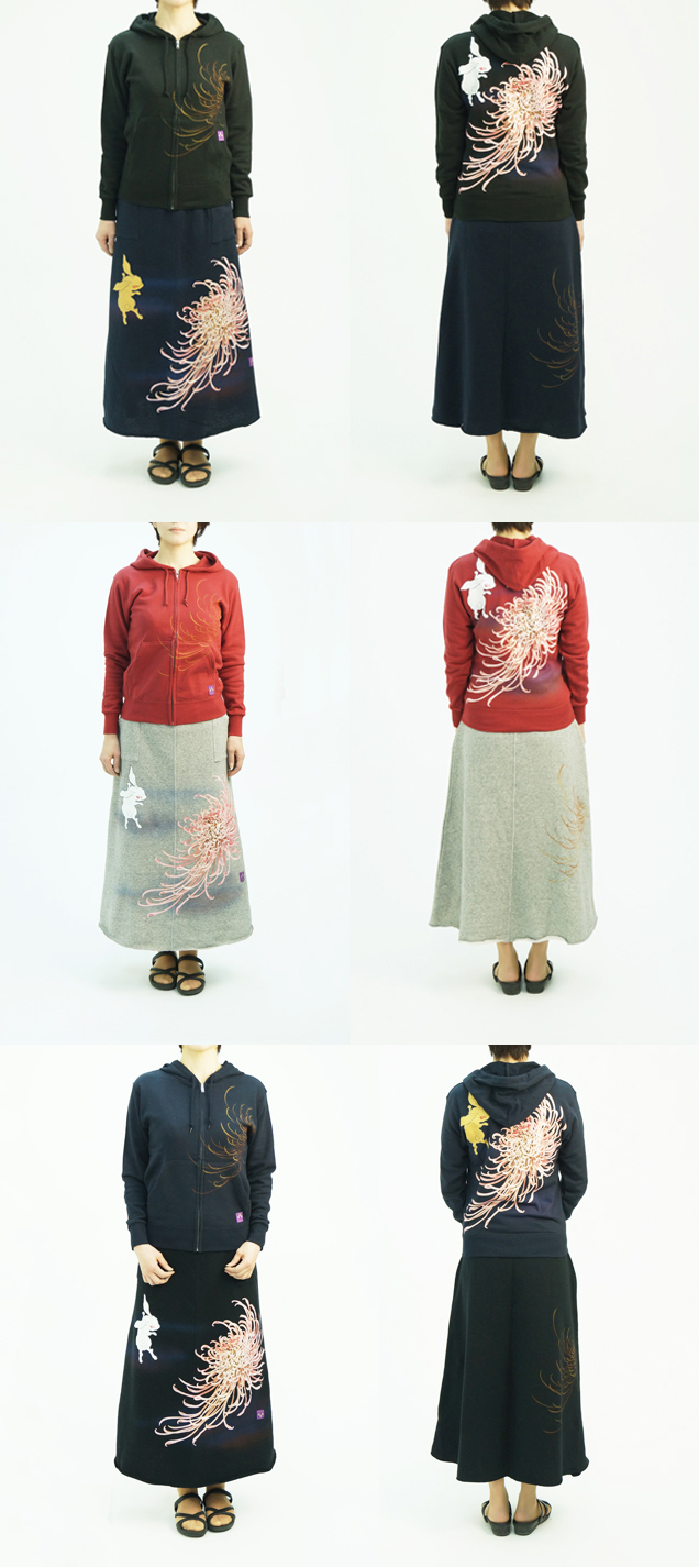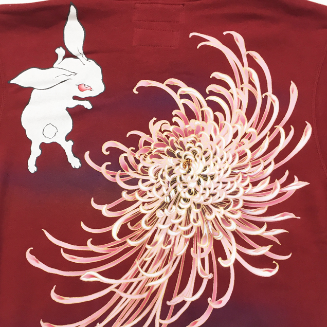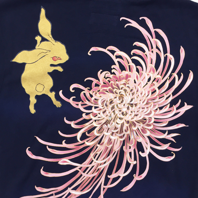 メンズに負けないクオリティでレディースもリリース。女性っぽく少し赤味のかかった乱菊になっております。兎を金で表現した紺色は生産量88枚の限定商品です!同柄もスカートも一緒に是非お楽しみ下さい【素材】