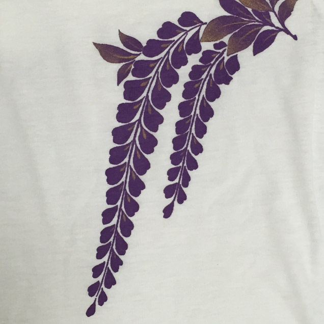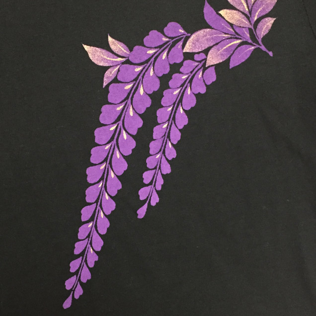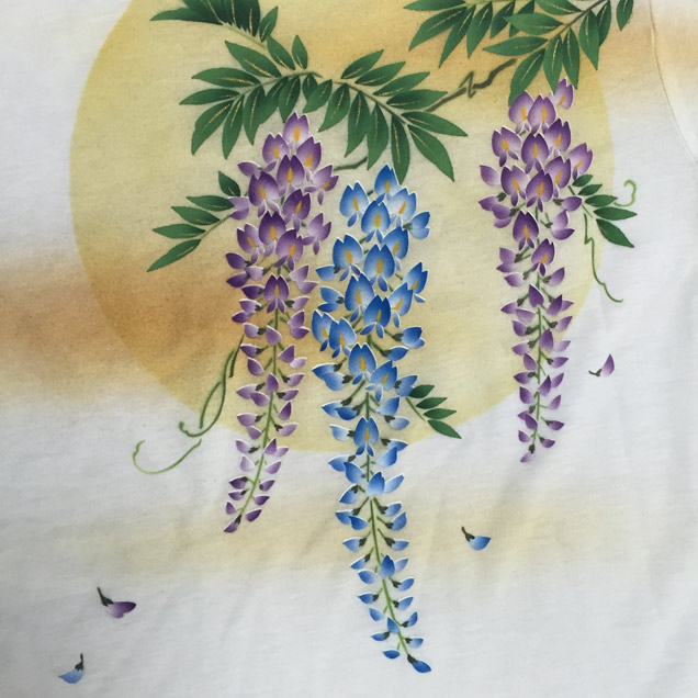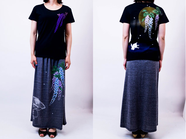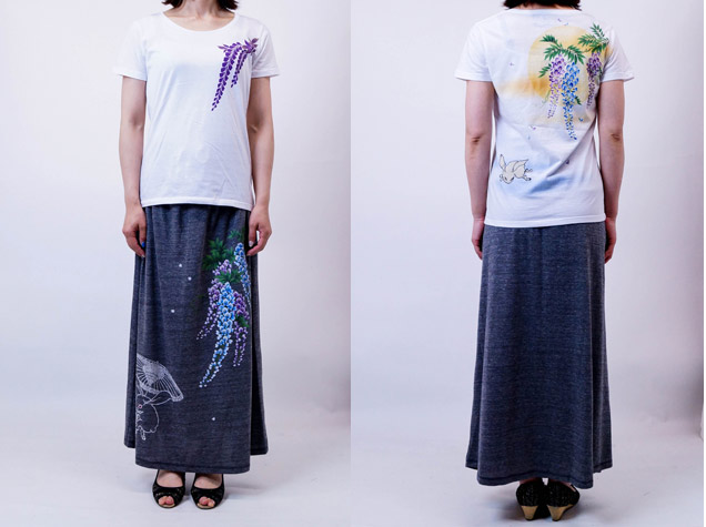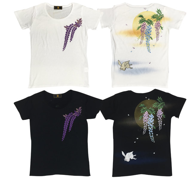 禅では人気のモチーフの月夜藤にちきりや兎が華麗に舞っています。Tシャツ自体にも拘り、首元や袖丈などを女性らしいシルエットにしやわらかい生地を