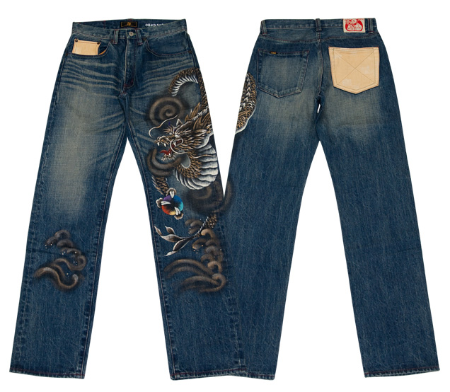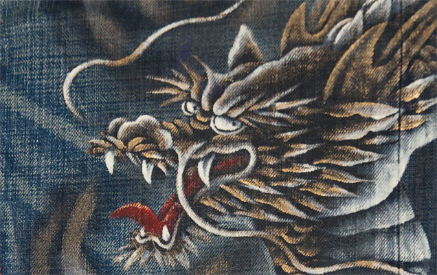 2008年新春限定でリリースのジーンズです。四神シリーズ第三段は、和柄では定番である、中国の伝説の生物であるとされる『龍』をモチーフに致しました。亀、鳳凰、麒麟と共に「四霊」と総称されています。光輝く珠をもち、渦と共に堂々とした姿を見せる龍。ジーンズはダメージ加工を施し、コインポケット・バックポケットに西陣裂地を使用しております。腰裏に入ったシリアルナンバーは、世界にひとつだけの証です。
