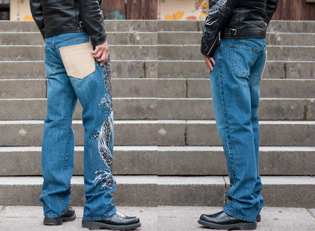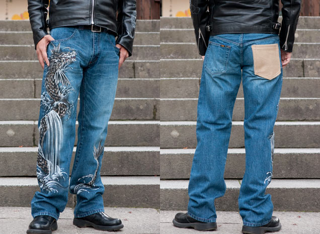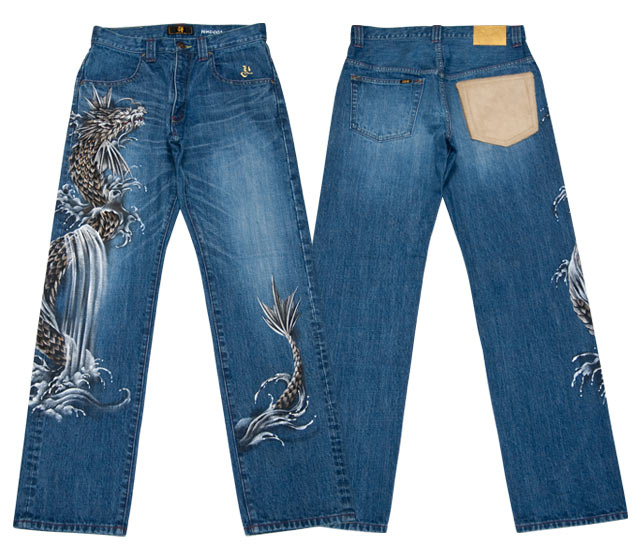 2010年新春限定ジーンズは、海面を突き破り、勢い良く水しぶきをあげるその名も「海龍」と名づけた豪快なジーンズです。片脚にしっかりと描き込まれた龍は、あの有名な「坂本竜馬」をイメージした龍。限定ジーンズだからこそ、今までよりも更に質の高い商品をお届け致します!!