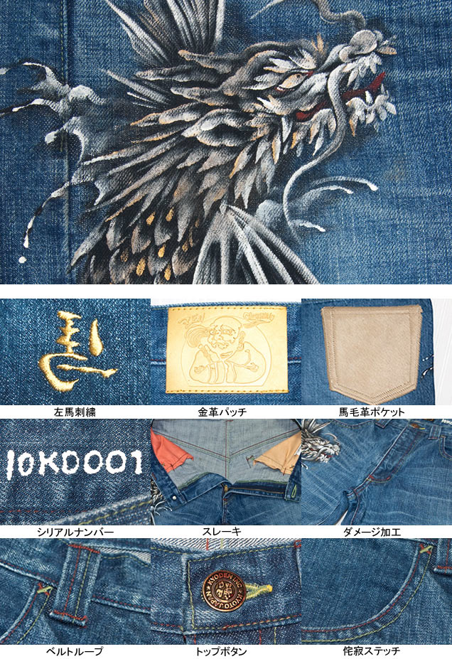 2010年の新春ジーンズは、大河ドラマで話題の坂本竜馬をイメージした、生産数限定ジーンズです。モチーフとしては、竜馬が中心となって結成された「海援隊」を連想させる海の竜。また、竜馬の名前から連想した馬の毛皮をバックポケットにあしらったり、「左馬」の刺繍、さらには上品なダメージ加工など、ジーンズの仕様にもこだわっております。カラー/絵柄