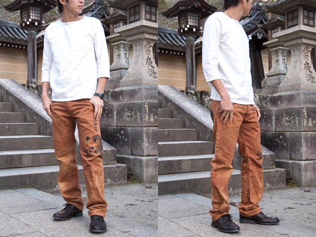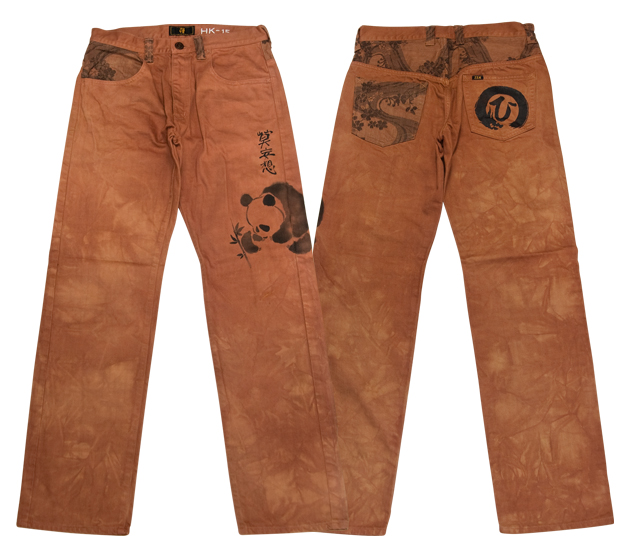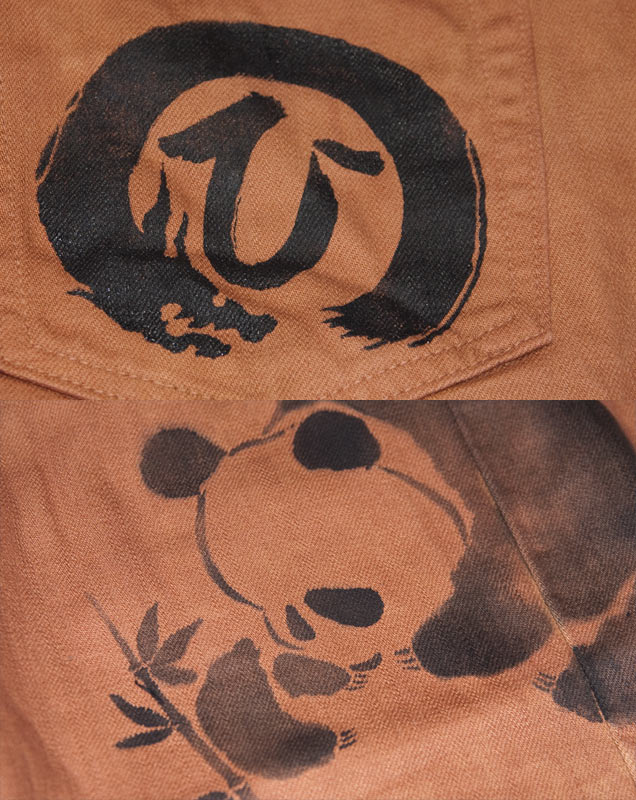 禅で大好評いただいておりますカラージャガードパンツの形をストレートにしたパンツに、東京上野を連想させるパンダをデザインし、墨絵調の手描きを施しております。