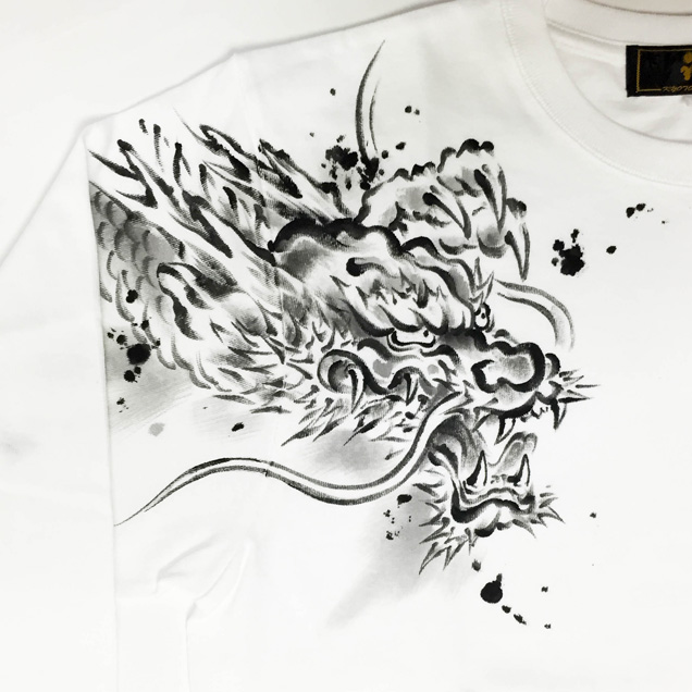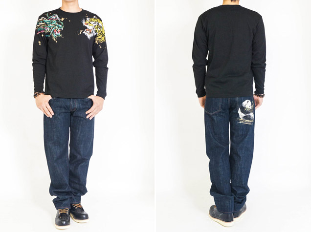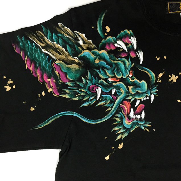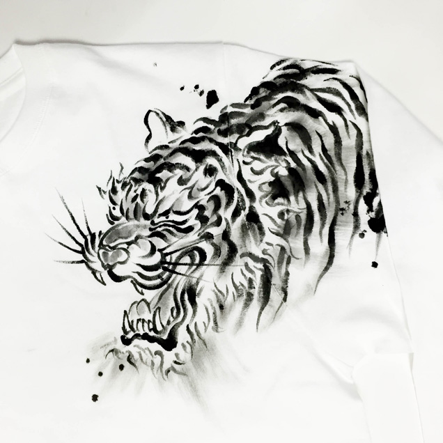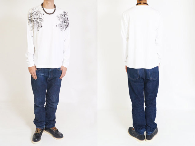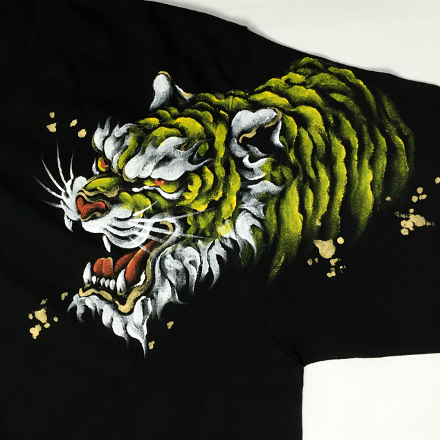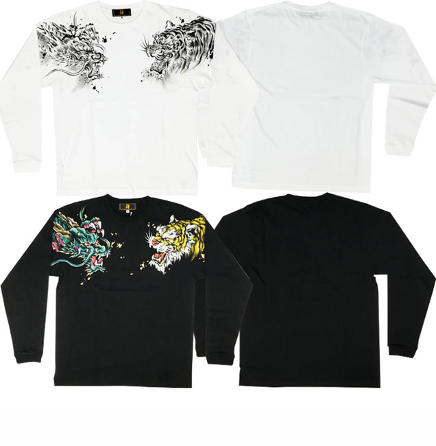 和柄の王道、龍虎のモチーフを贅沢に描きこんだ長袖Tシャツ。両肩に迫力満点の龍と虎を大胆に手描き。