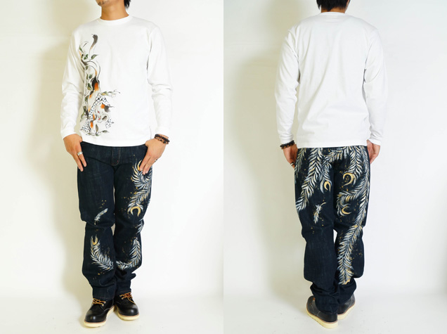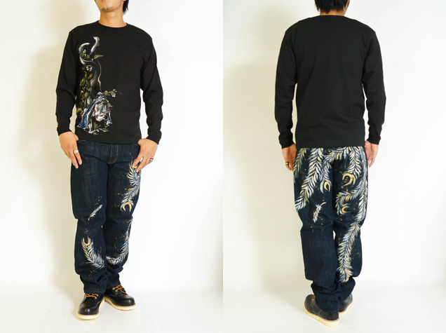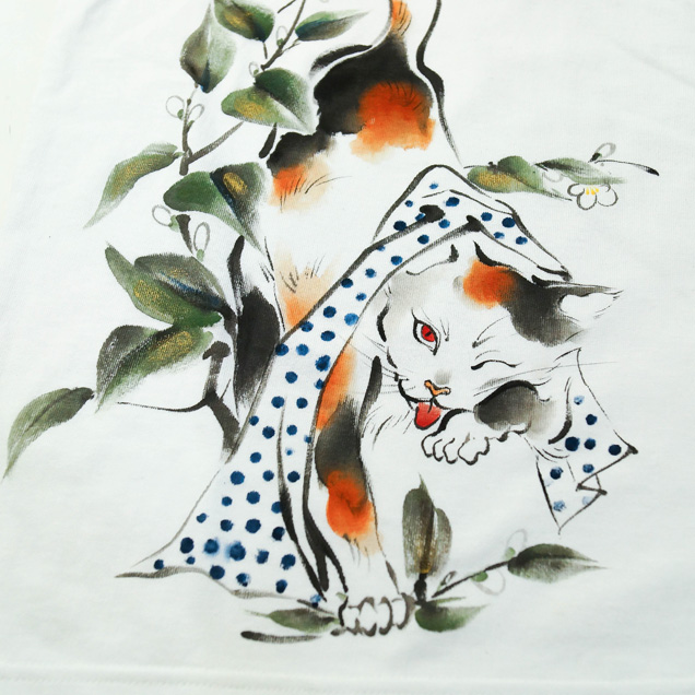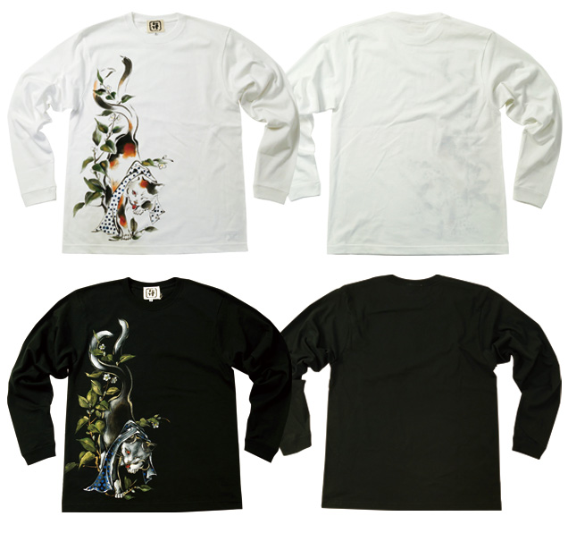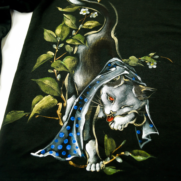 日本古来より伝わる妖怪である猫又を長袖Tシャツに手描き。二股に分かれた尾や鋭く光る赤目など、可愛らしさの中に
