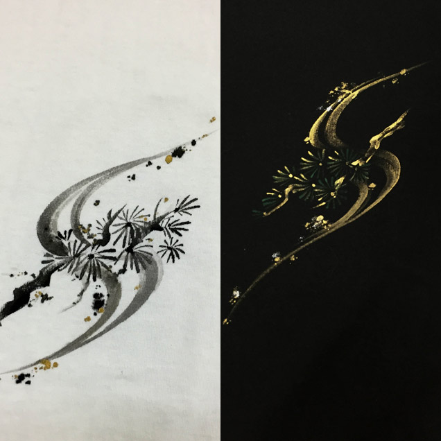 柄がはっきりと表現された黒地Tシャツと水墨画風に描かれた上品な