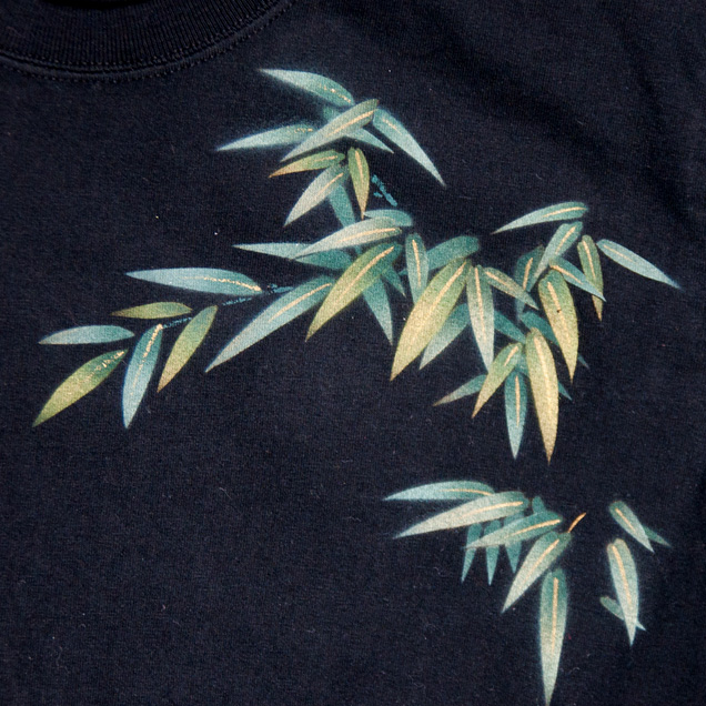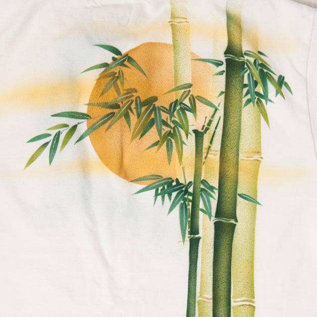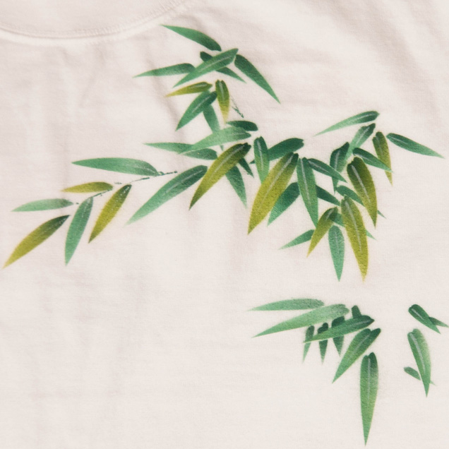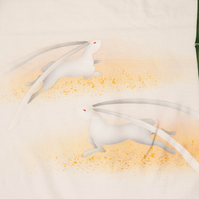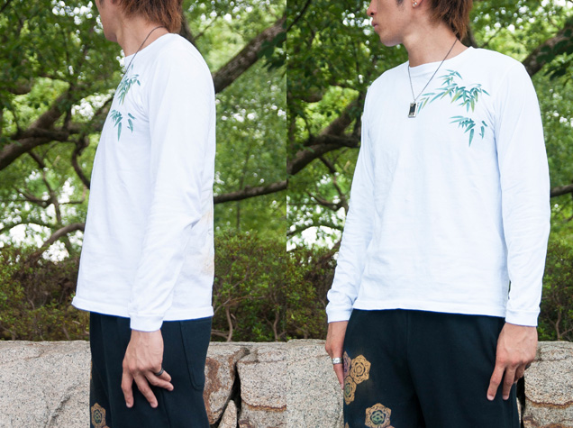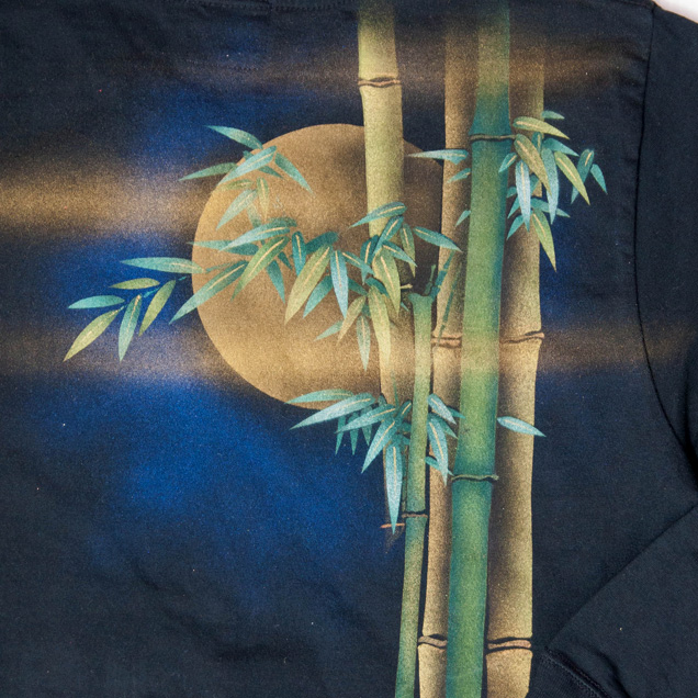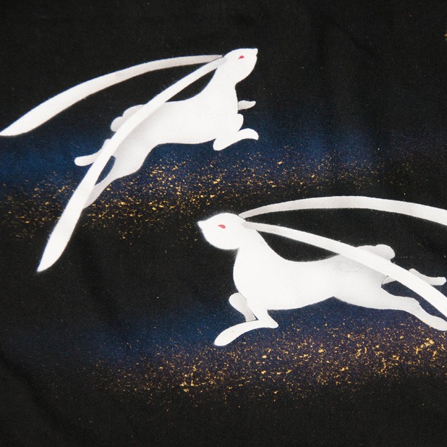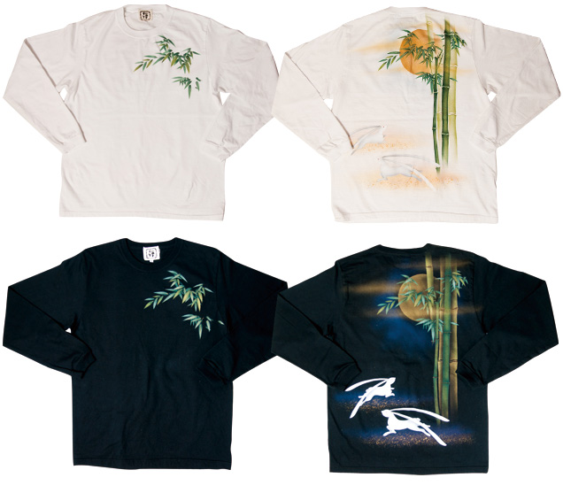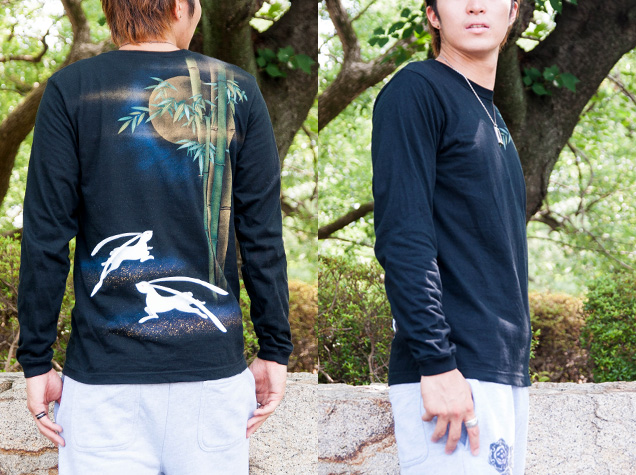月夜の竹に兎、という珍しい組み合わせの長袖Tシャツです。耳や身体を長く描いた兎は幻想的で柄全体が少し神秘的な雰囲気に仕上がっています。