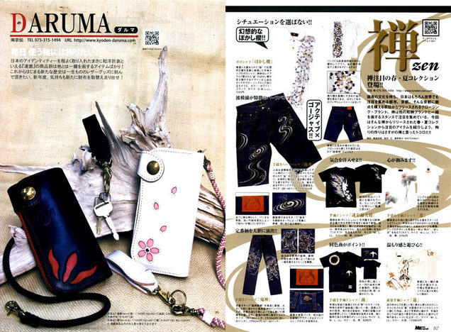 右側 : ハーフパンツ「流水」 / 和柄ポロシャツ「ぼかし櫻」 / 和柄Tシャツ 「迷企羅大将」 「蓮」 「燕」 / 和柄半袖シャツ 「蓮」左側 : 達磨ウォレット / 櫻レザーウォレット