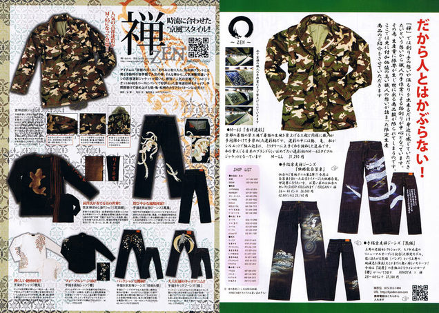 右側 : 吉祥迷彩ジャケット / 鳳凰ジーンズ / 疋田鯉 / 櫻兎 / 櫻 / 鶴 左側 : 吉祥迷彩ジャケット / 独眼龍白装束白龍・ORGAN限定ジーンズ / 龍熊猫・HINOYA限定ジーンズ /