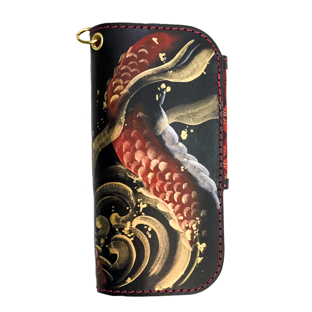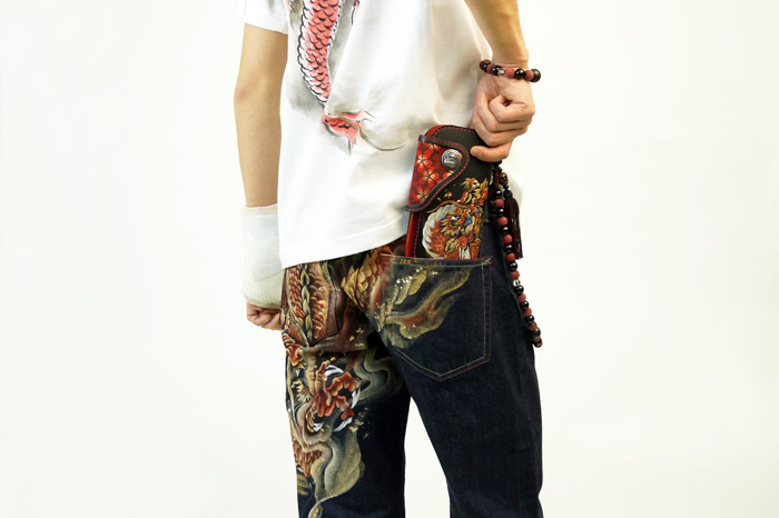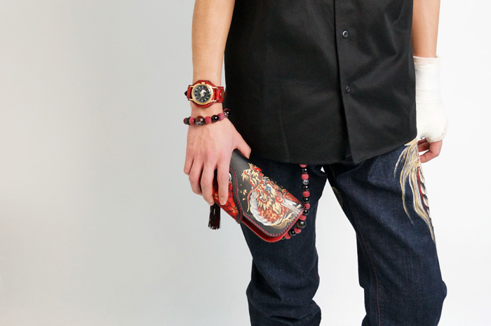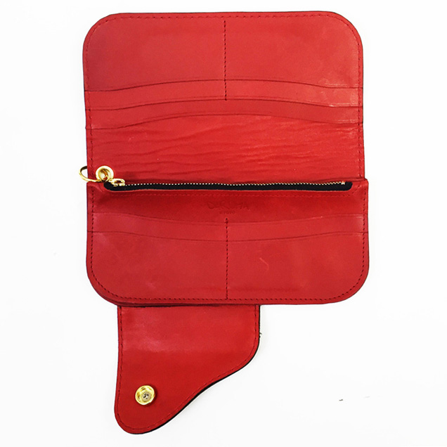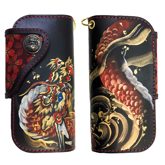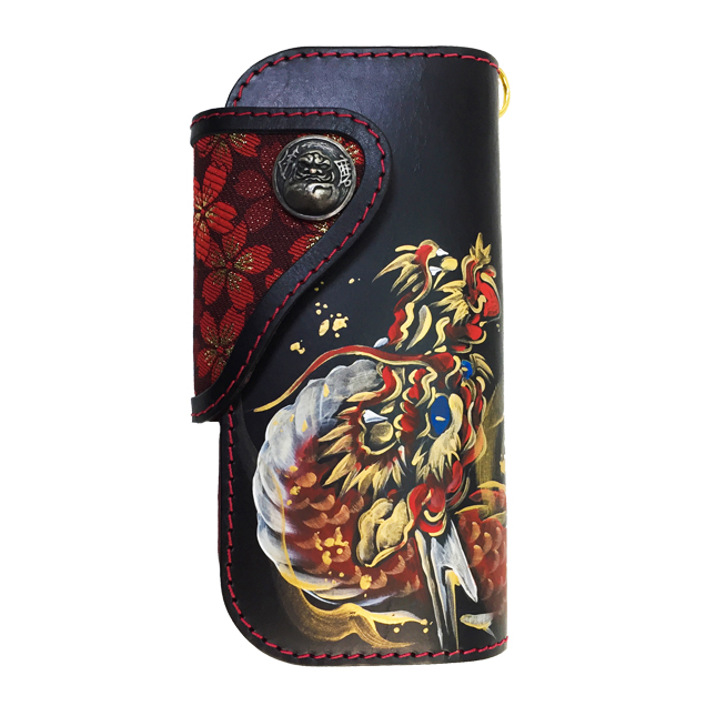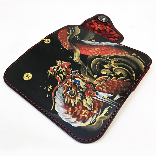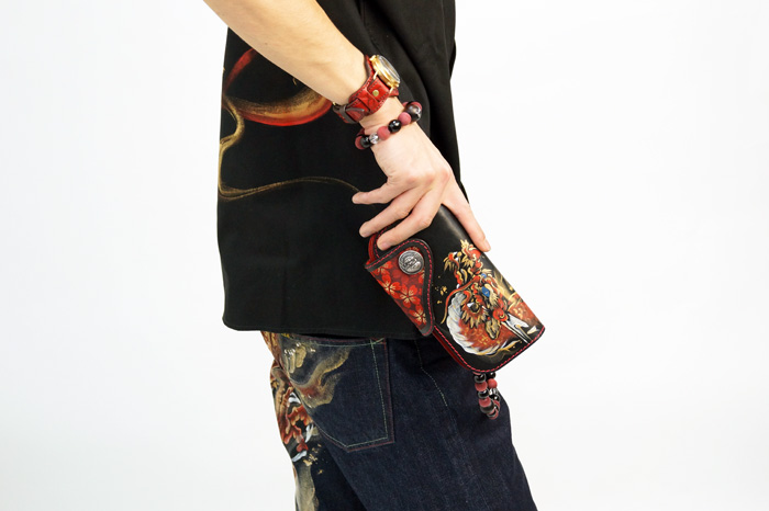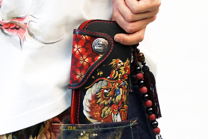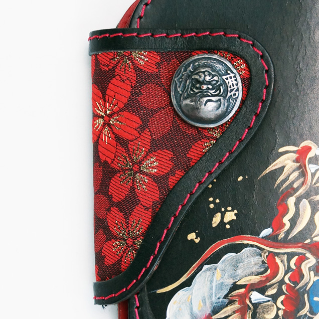 手描きレザーウォレット「赤龍」のご紹介です。絵柄に合わせてフラップ部分には赤い櫻の金襴を貼り付けております。迫力ある赤龍が達磨らしい世界感を演出。中作りは赤色と金色の2色用意しているのですが赤は限定30個しか生産していないレアアイテムになりますので気になる方はお早めに!念珠のウォレットロープやジーンズは勿論、他の雑貨や洋服も一緒にお楽しみ下さい※商品写真の色調に関しては実際のものに近づけるように努めておりますが、
