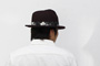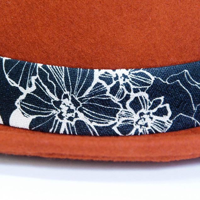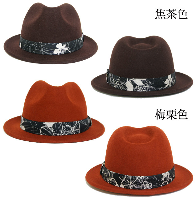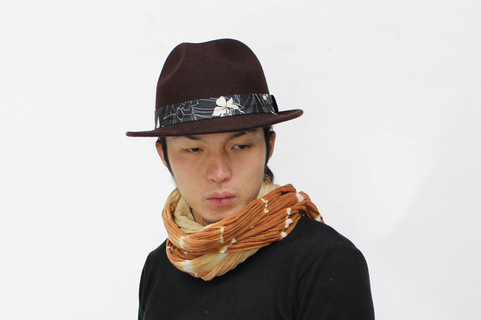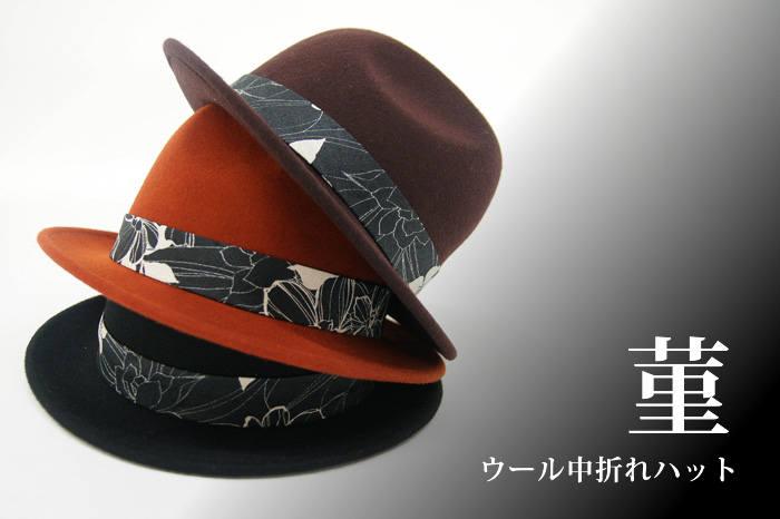 人気の菫生地を渋い色目の中折れ帽に巻きました。帽子自体を上品な形に仕上げ渋い色目に合うようになっております。