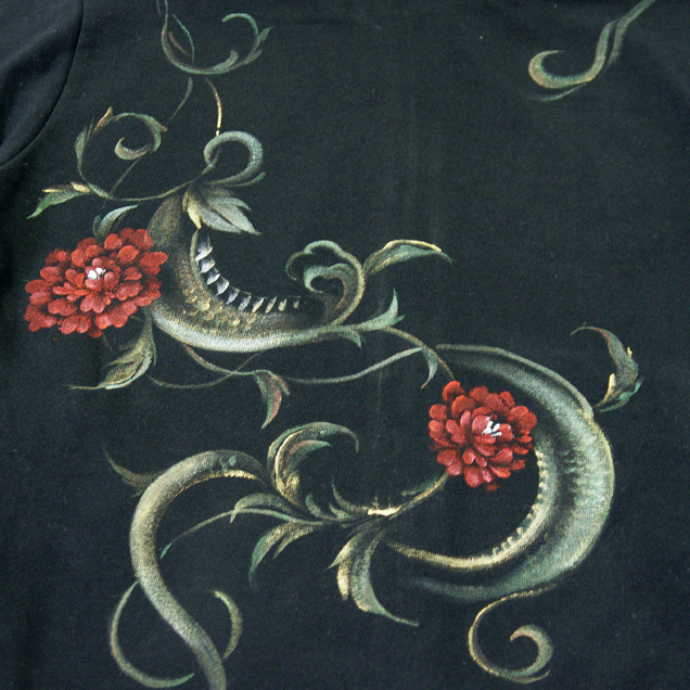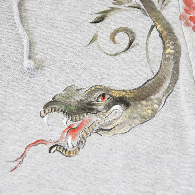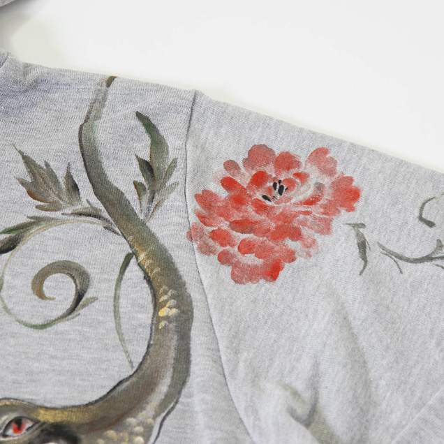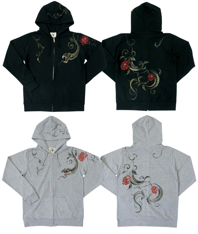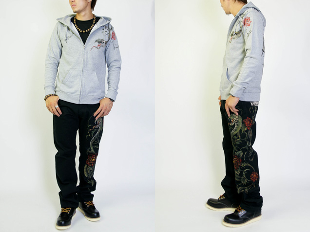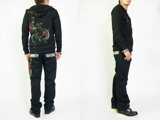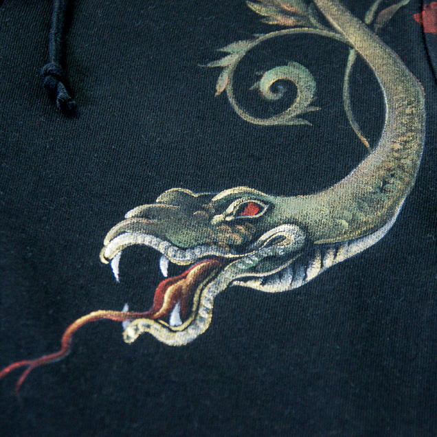 ブラックジーンズと合わせてコーディネートして頂きたいアイテムがこちら!ブラックジーンズ同様生い茂る唐草が蛇へと変化する様子を描いたパーカーは