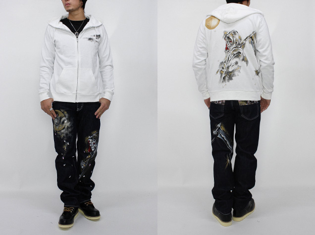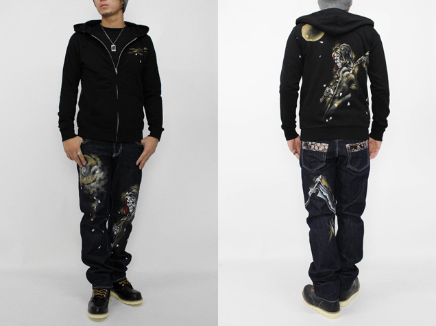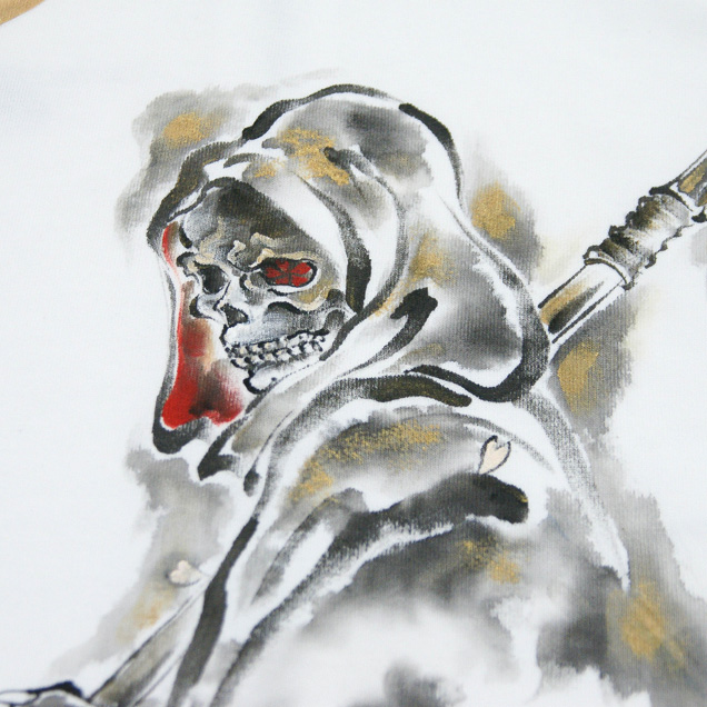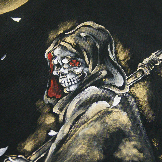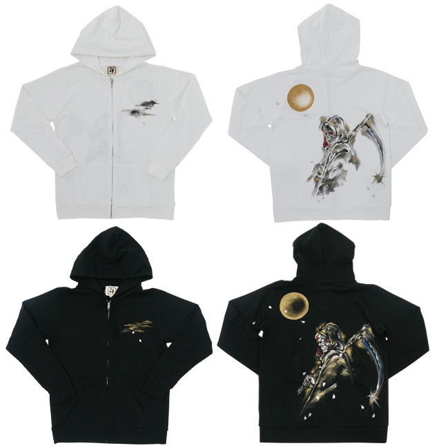 この秋、手描きジーンズでご好評頂いた死神櫻が長袖パーカーで登場。キラリと光る大きな鎌を持ち、月夜の光を浴びた死神は迫力満点。