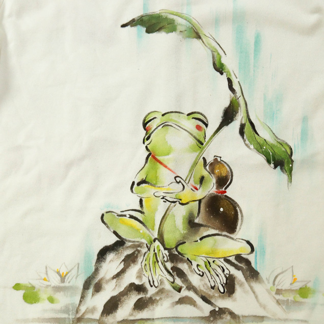 人気の酒蛙シリーズ第三弾!雨水を葉っぱで凌ぎ、岩の上で座禅を組む蛙を手描きならではの柔らかいタッチで表現。