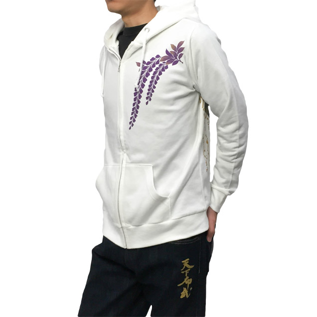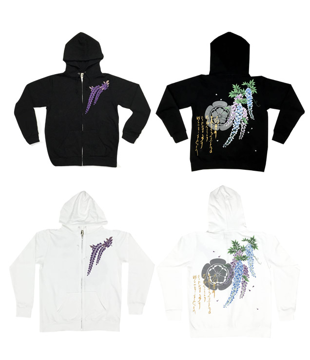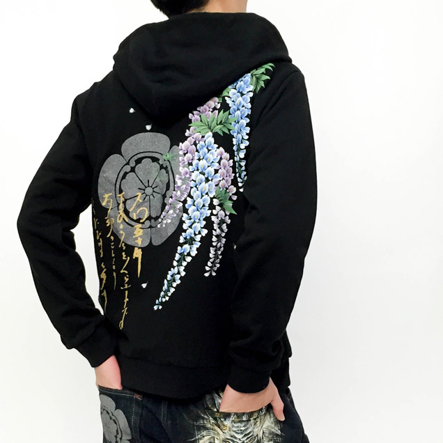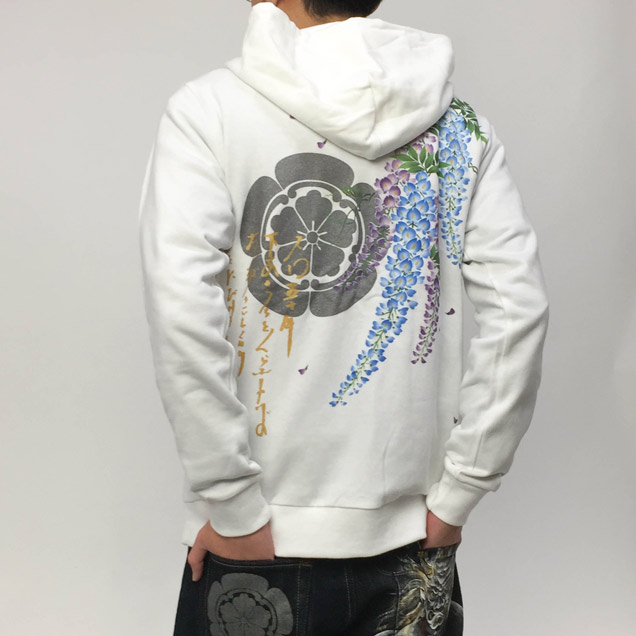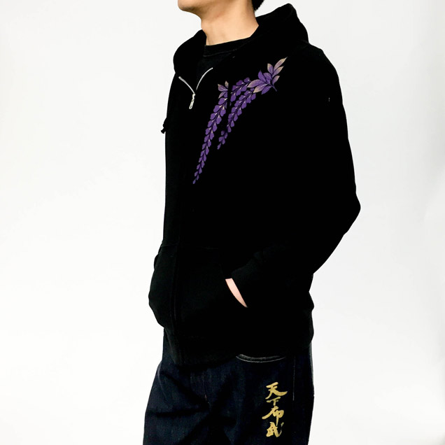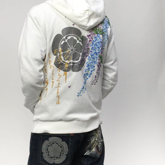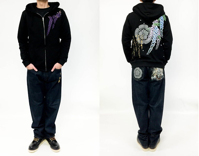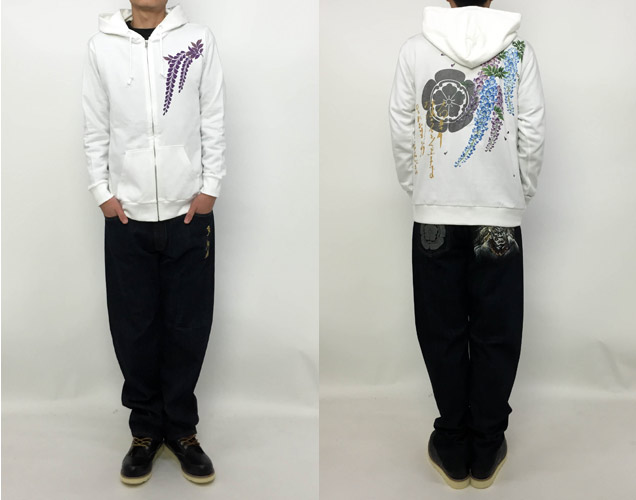 ジーンズに合わせた織田信長モデルのパーカー。家紋【織田木瓜】に藤の華を合わせ、華麗で妖艶な雰囲気を演出しました!