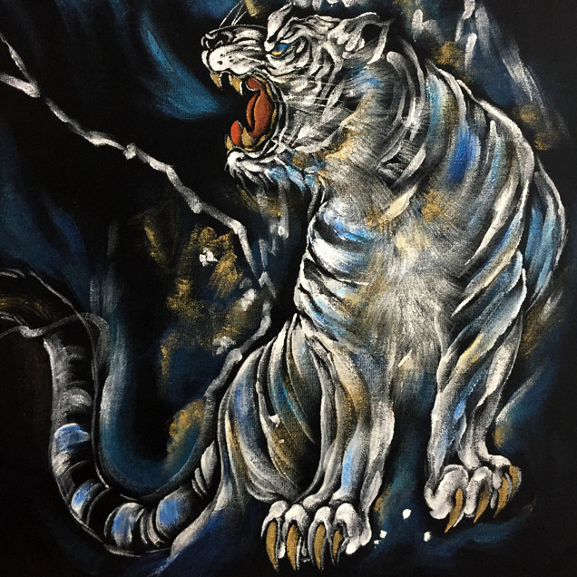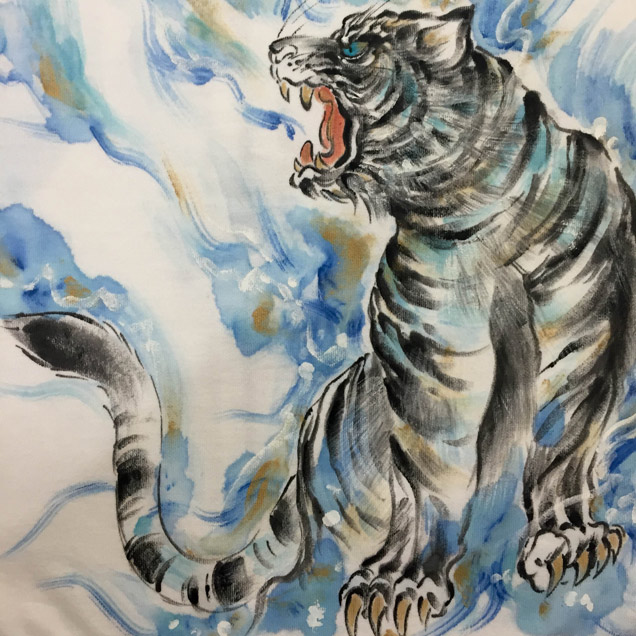 青の気を放す白虎を背中に描いております。しっかり描き込まれた虎の表情はさすが京の絵師と言ったところ。