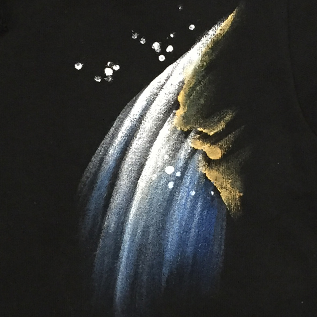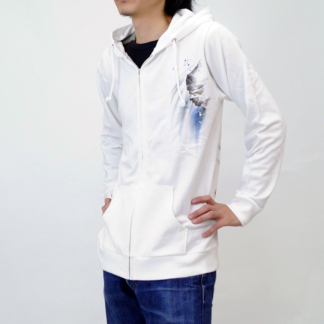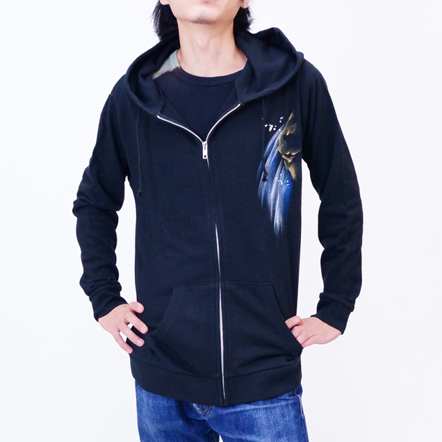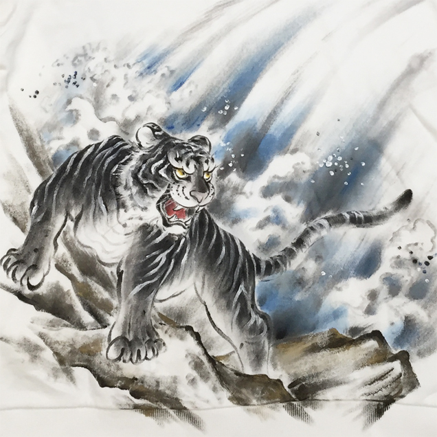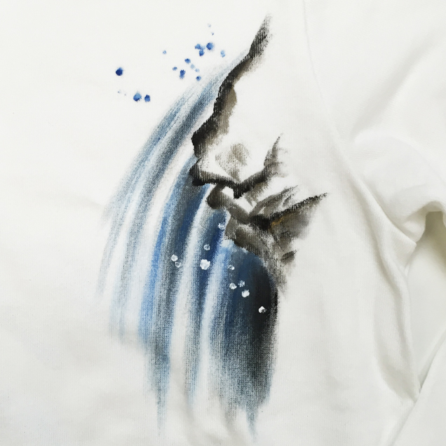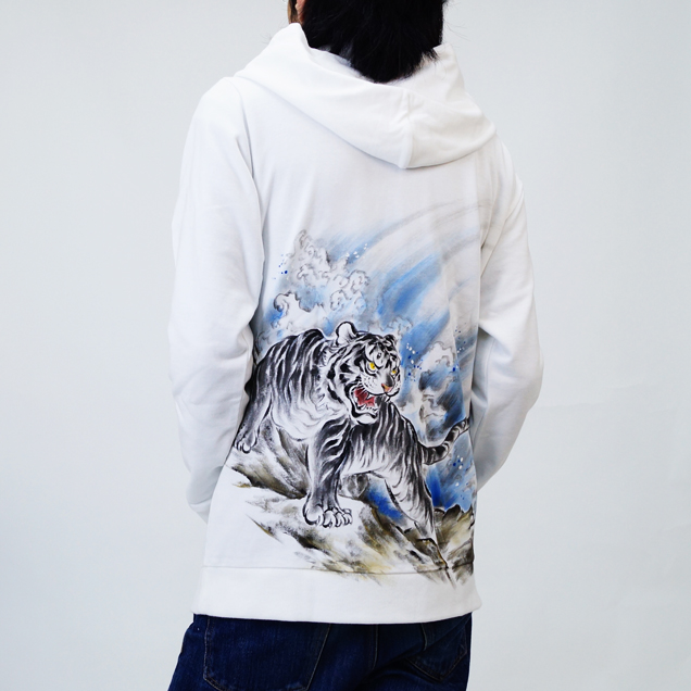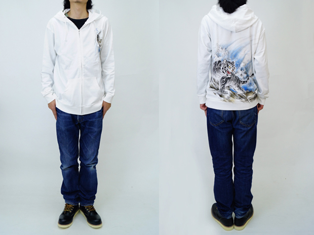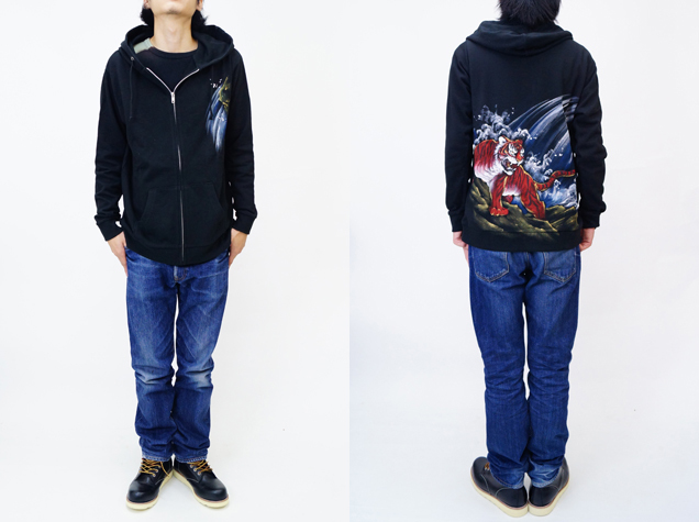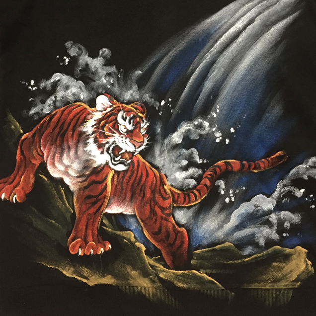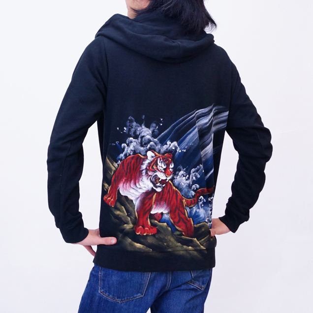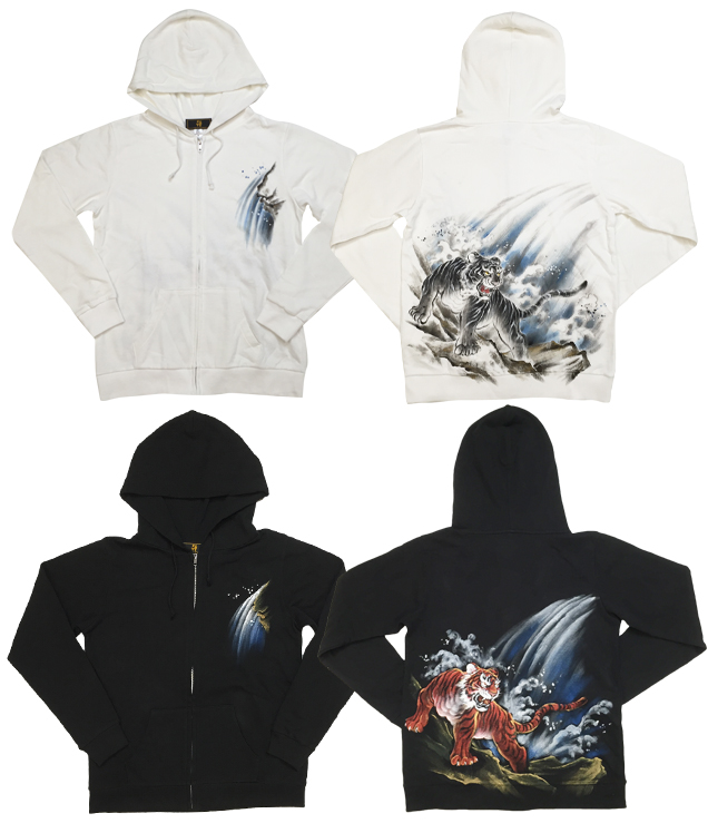 黄色や白の定番カラーではなく黒や赤を使った珍しい虎を描いたパーカー。滝の激しい水しぶきで迫力を演出。ちょっと変わった虎