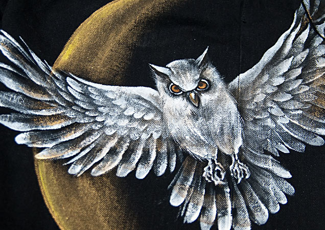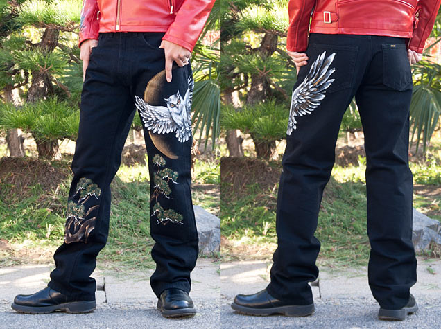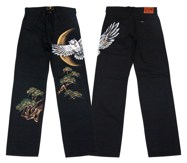 月を背に、大きく翼を広げる大胆な梟を手描きで表現致しました。梟は夜行性でほぼ真後ろまで見渡せる視界の広さから、心理を見つめる鳥とされ最高位の動物神として崇拝されていました。この鋭く光る眼光で心理を見つめます。ボディーとなるジーンズは、デニムの名産、岡山倉敷市児島で制作したオリジナルジーンズです。形は飽きのこないストレートで、長年ご愛用いただけます。国産にこだわった、禅らしい一本に仕上がりました。