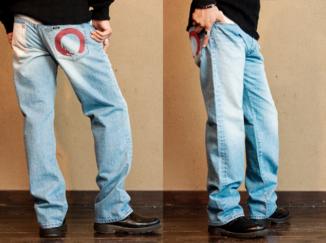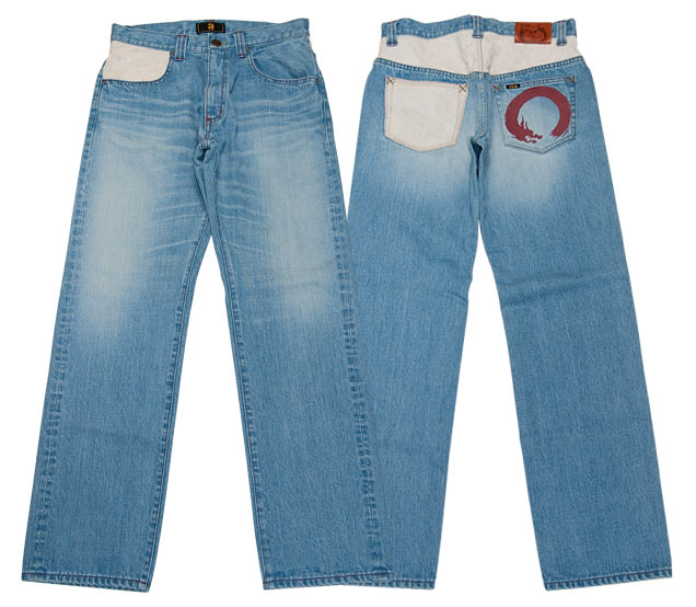 鮮やかなブルーに映えるよう、一円龍の色を侘寂カラーの色と統一。カジュアルになりがちなブリーチデニムですが、ここでさりげない和を主張しています。持っていると活躍間違いなしの一本です。