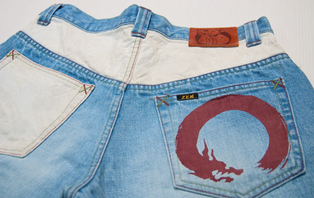 禅ロゴである「一円龍」を、ブリーチデニムに施しました。ロゴの色はデニムステッチ侘寂カラーの、あずき色に合わせました。言葉にするのが難しい「絶対的真理」を伝えるのに人は円を描いたと言われています。円は始まりも無ければ終わりもない円満と広がりの象徴であり、禅の一円龍では、この真理に基づき終わりの無い拘りの物創りを追求するという思いを表しています。