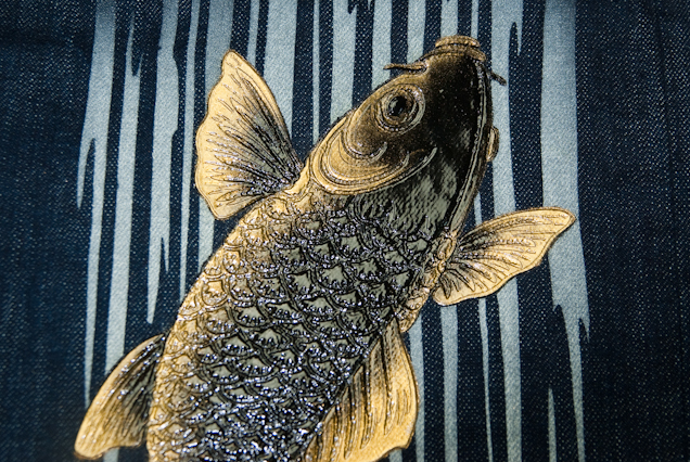更に、今回のこの登鯉のデザインは鯉の下に力強く表現された荒波は、カキ殻を天日に晒し、長いものになると何十年もかけ風化させ粉砕して造る胡粉という画材を使用しおり、また鯉の後ろに勢いよく描かれる滝の流れは京友禅の型染めの技法を用いて表現された非常に贅沢な逸品となっております。