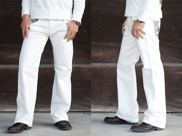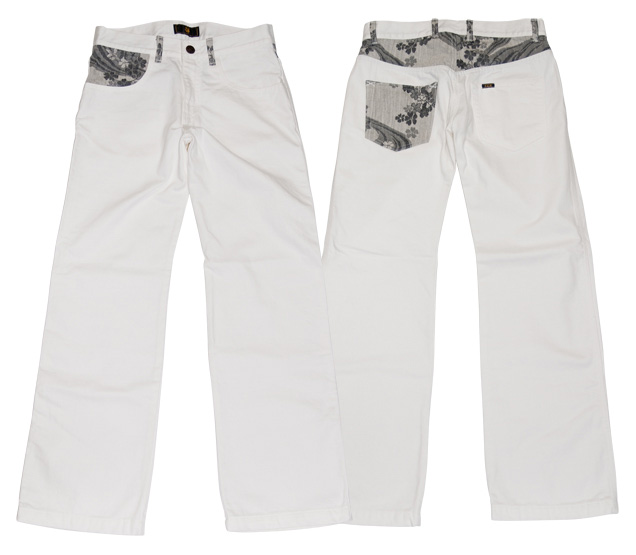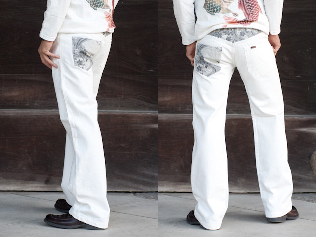 ホワイトデニムと、ジャガード織で仕上げた流水櫻文様のデニムを組み合わせた、爽やかなジーンズです。立体裁断など、こだわりのラインをお楽しみ下さい。