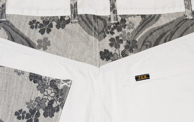 禅のカラーパンツ第2弾!ジャガード織で流水櫻を表現し、その生地を部分的に仕様したジーンズです。同色系でまとめられた、非常に清潔感が感じられるジーンズとなっております。