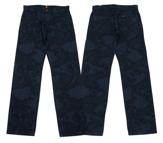 流水櫻文様のジャガード生地でジーンズを縫製し、絶妙な色合いで染上げた禅のカラーパンツです。ジャガードの流水櫻文様を活かした、柄が浮き出るギリギリの濃度で染色しております。目立ちすぎず、落ち着きすぎてもいない。よく見ると品良く和のテイストが盛り込まれている、このような商品がこれから求められるのではないでしょうか。